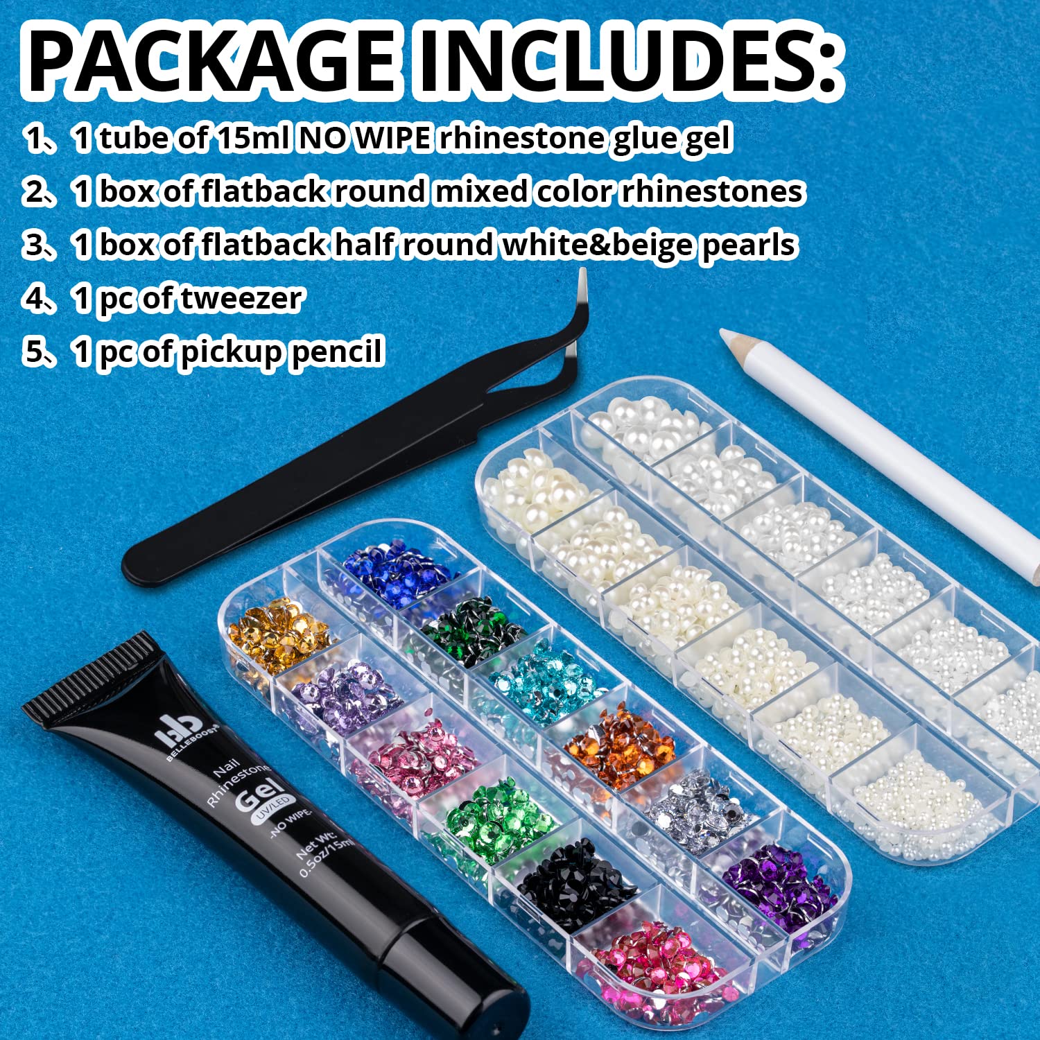 - đWHAT YOU WILL RECEIVE: This package contains 1 pc of 15ml tube design NO WIPE rhinestone gel glue; 1 box of flat back round mixed color rhinestones; 1 box of white&beige half round pearls; 1 pc of picker pencil and 1 pc of tweezer. This set helps you decorate your nails more conveniently.