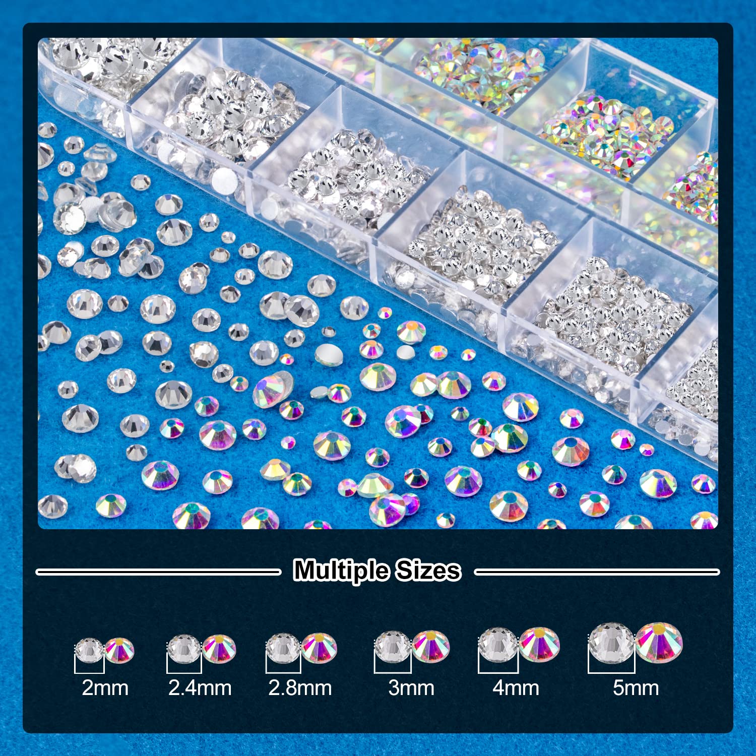- đCOMBINATION&MULTIPLE SIZES: This set provides 1 box of Flat-back glass round AB&clear rhinestones with 6 sizes: 2mmă2.4mmă2.8mmă3mmă4mmă5mm; 1 box of Flat-back white&beige half round pearls with 6 sizes: 2mm, 2.5mm, 3mm, 4mm, 5mm, 6mm. Great size range and combination with rhinestones and pearls for your nail art decoration!