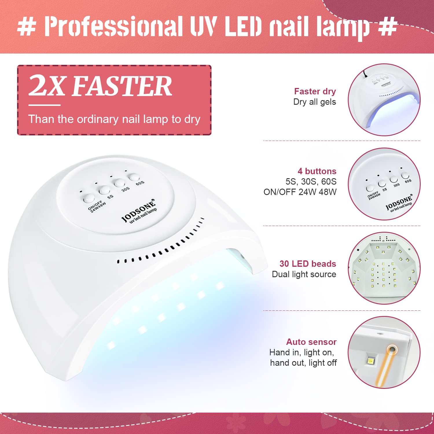 - Nail Lamp:This nail lamp has three curing modes: 5S, 30S, and 60S. Usually, you can choose the curing mode according to the amount of gel nail polish you use, or choose the mode that suits you. The LED screen displays the usage time. The nail lamp has 30 small LED beads, which can quickly and safely cure gel nail polish in all directions. Suitable for almost all gel nail polish.