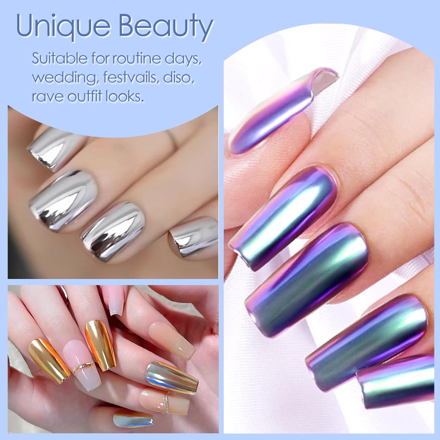 - 【Amazing Nail Chrome Powder】Allstarry chrome powder set(gold and silver chrome nail powder & chameleon chrome powder) can create shining chrome effects when rubbing it on nails. The rub on gold chrome nail powder is suitable for applying on gel polish nails, builder gel nails, dip acrylic powder manicures, and acrylic press-on nails. And the gold nail chrome powder has different results over different color nails. Try chrome powder for nails and meet your styles.