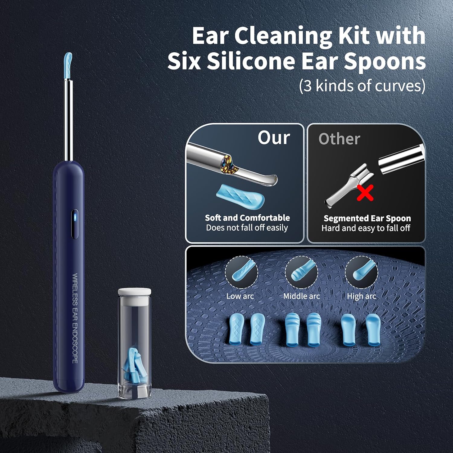 - [ 3 Kinds of Curved Soft Spoons ] The earwax cleaner camera has five highly flexible interchangeable silicone ear spoons. The clean earwax wifi visible wax removal spoon is made of soft silicone material and fits and cleans the ear comfortably. Please note that before each use, please tighten the silicone sleeve on the ear spoon to avoid scratching the ear canal.