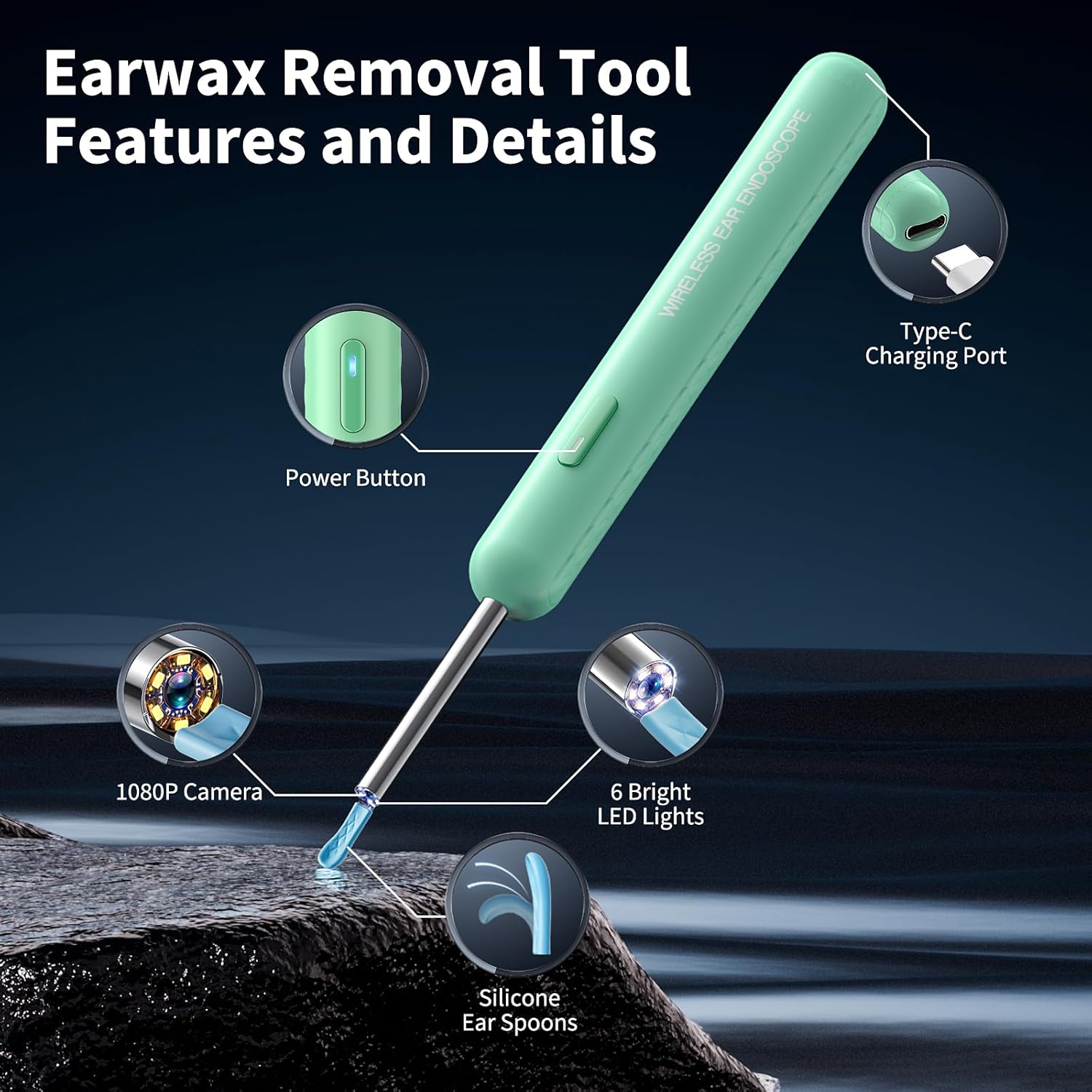 Ear Wax Removal, Ear Cleaner with Camera and Light, Ear Wax Removal Kit with 8 Pcs Set, Ear Wax Removal Tool Camera with 1080P, Ear Cleaning Kit with 6 Spoons, Ear Camera for iOS & Android (Green)