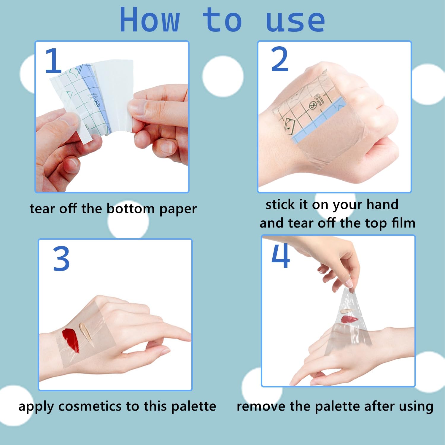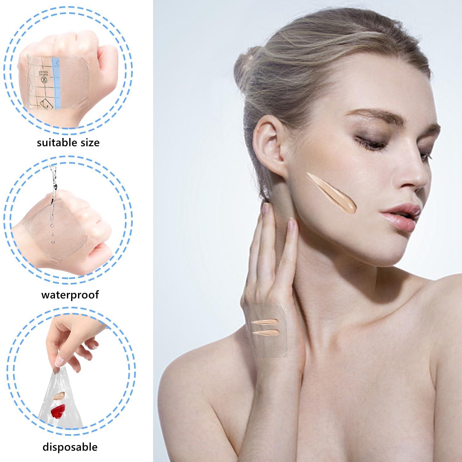- [Widely Application] In addition to acting as a temporary makeup board, disposable PU film has special waterproof properties, enabling it to act as a barrier to protect the bandage from moisture or water, making you feel more at home while swimming or bathing.