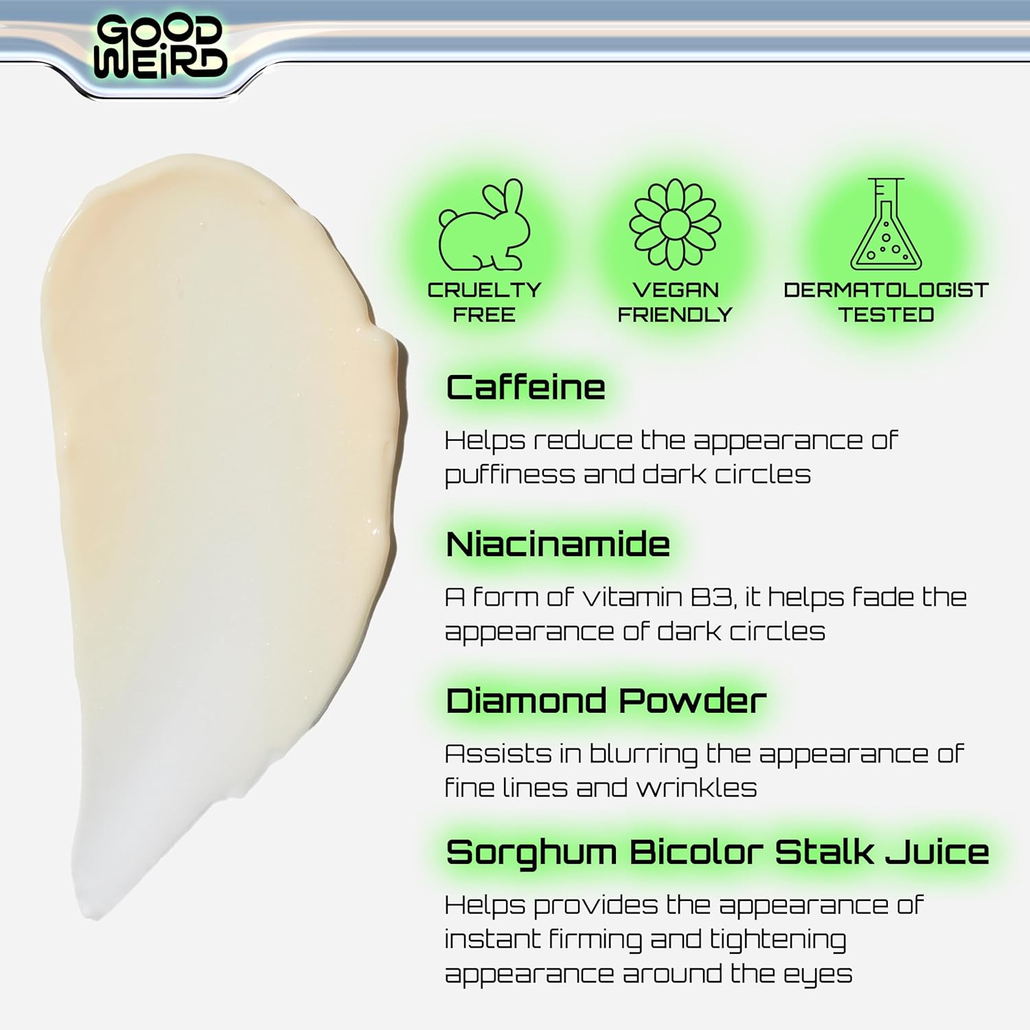 - The Ultimate Under Eye Brightener: Good Weird is here to optimize your beauty routine. Our Cold Brew Undereye is a caffeine-infused under eye cream that effectively targets dark circles and puffiness, giving your eyes a refreshed and revitalized look. It's designed for everyone.