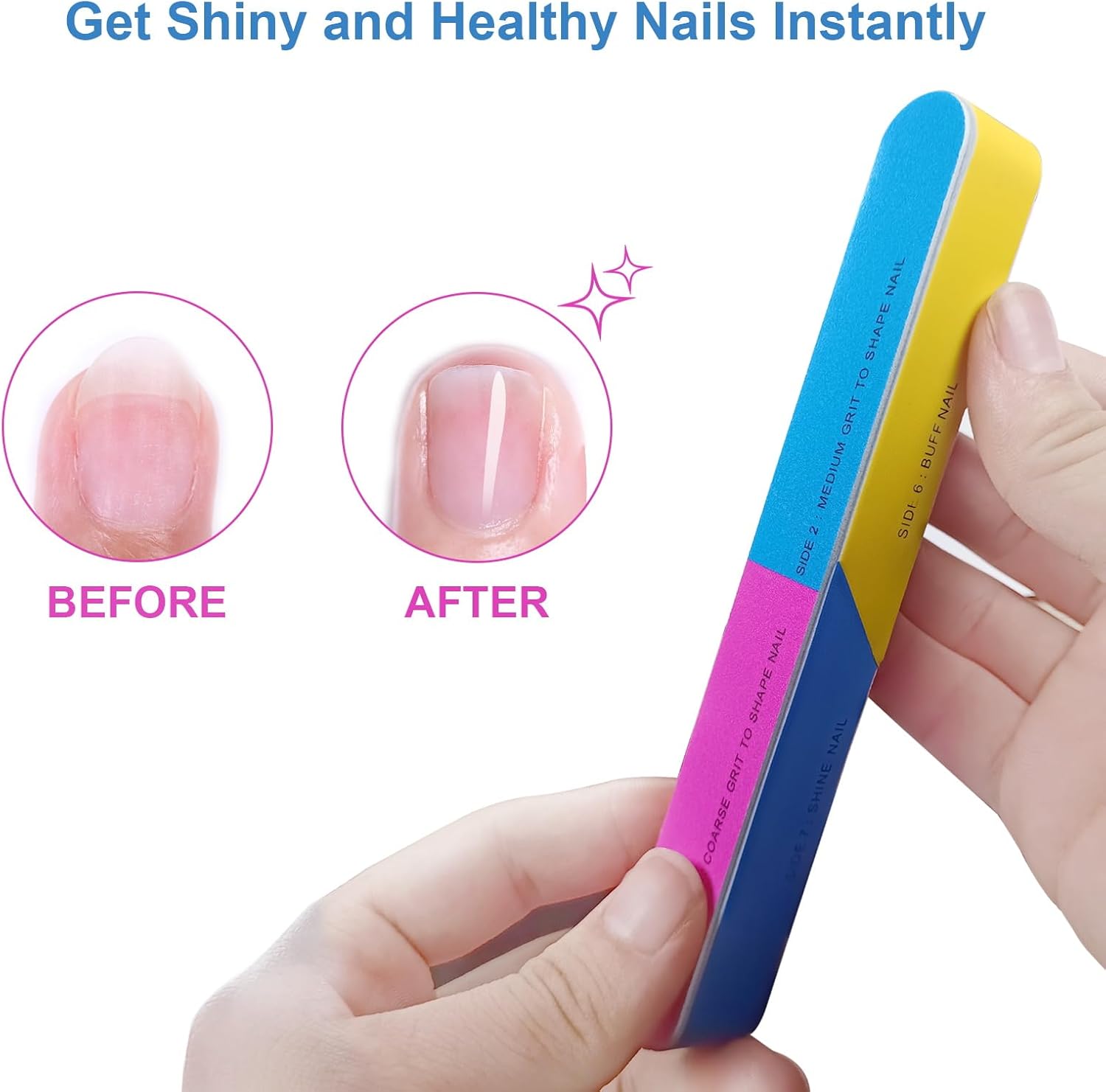- 7 Sides Nail Buffer Blocks for Natural Nails: Our nail buffer features 7 surfaces in 7 different colors, each showcasing a specific step for filing and shining nails. Every surface offers a unique level of smoothness/grit, making it easy to achieve naturally smooth and shiny nails in just seven simple steps. Each side is conveniently numbered to guide you in the proper order of use and clearly indicates the function of each surface.