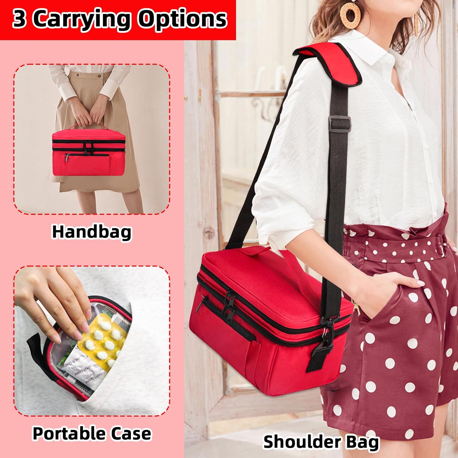 - 【3 Different Portable Methods】The medication bag comes with carrying handle and an adjustable shoulder strap. You can also take just a portable pouch when go on a trip. The lockable zippers (without lock) is designed for privacy and security protection.
