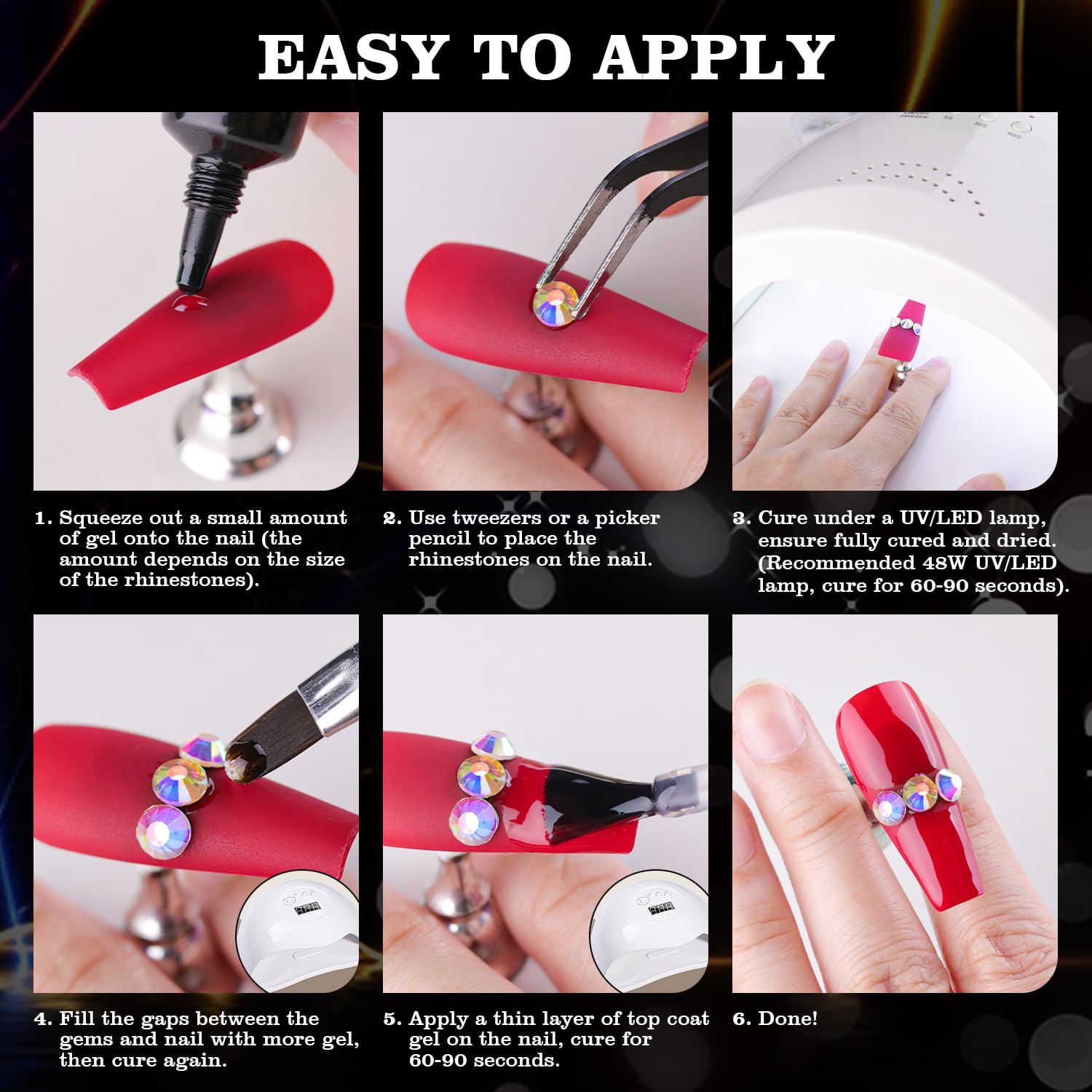 - đADHESIVE GEL GLUE -- The crystal clear nail gem glue uses a special, non-toxic and eco-friendly formula with strong tackiness, adhesion, and fluidity for easily applying decorations. It is a type of UV gel glue. After proper curing under a UV/LED lamp, the glue dries clear with superior bonding strength that can last weeks without falling off. With the designed tip, you can easily and conveniently apply the glue to the nail bed or the surface of false nails.