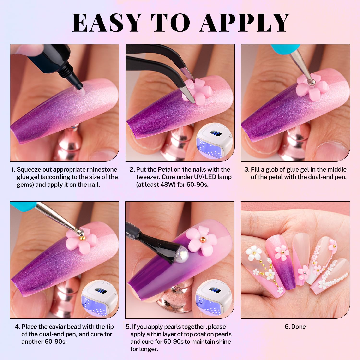 - đADHESIVE GEL GLUE -- The crystal clear nail gem glue uses a special, non-toxic and eco-friendly formula with strong tackiness, adhesion, and fluidity for easily applying decorations. It is a type of UV gel glue. After proper application and curing under a UV/LED lamp, the glue dries clear with superior bonding strength that can last weeks without falling off. With the designed tip, you can easily and conveniently apply the glue to the nail bed or the surface of false nails.