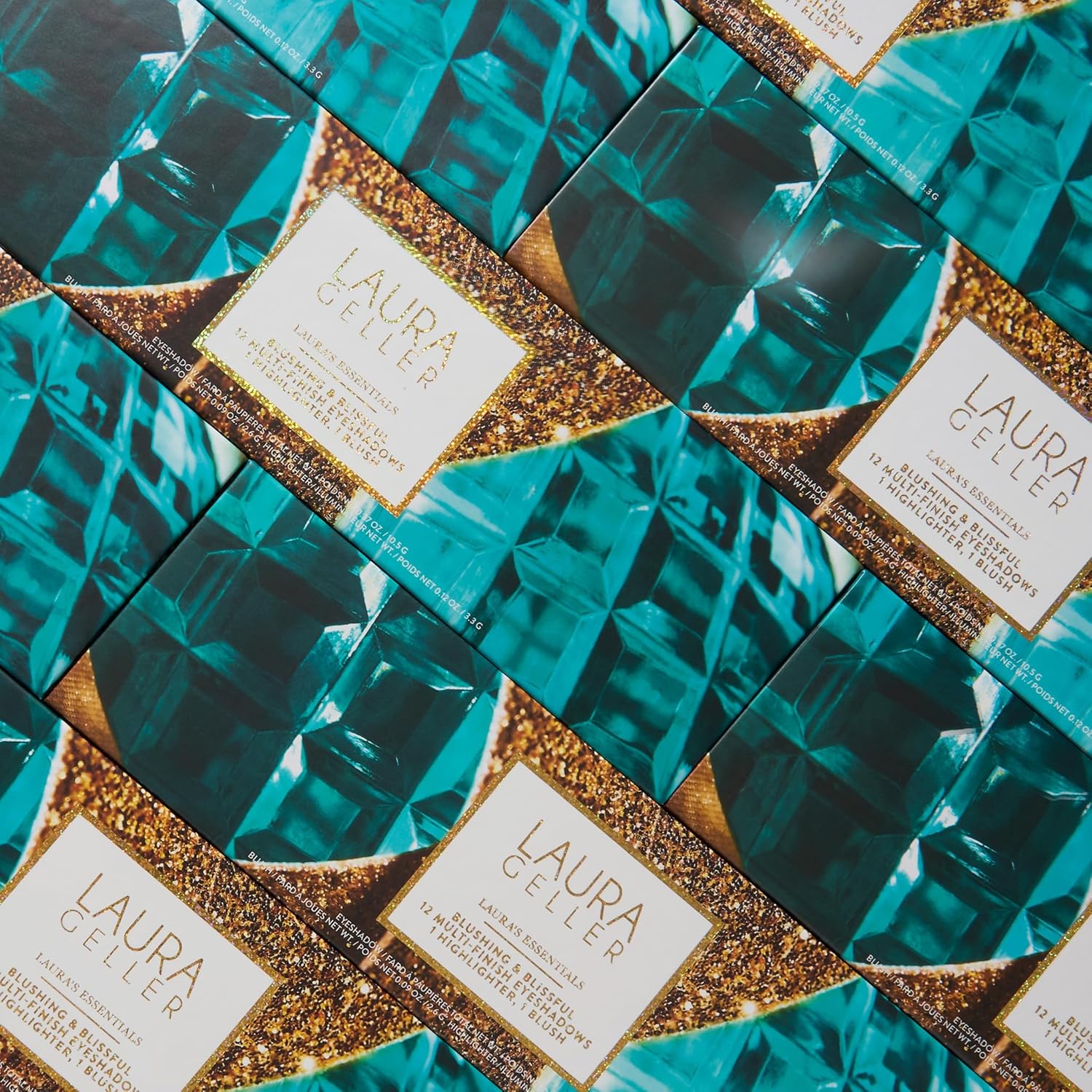- INCLUDES 12 EYESHADOWS AND TWO BLUSHESLaura Gellerâs luxurious full face makeup palette has you covered when it comes to blissful colors you canât get enough of! Enjoy 12 pressed eyeshadow shades and two beautiful blushes for a warm, rosy look.