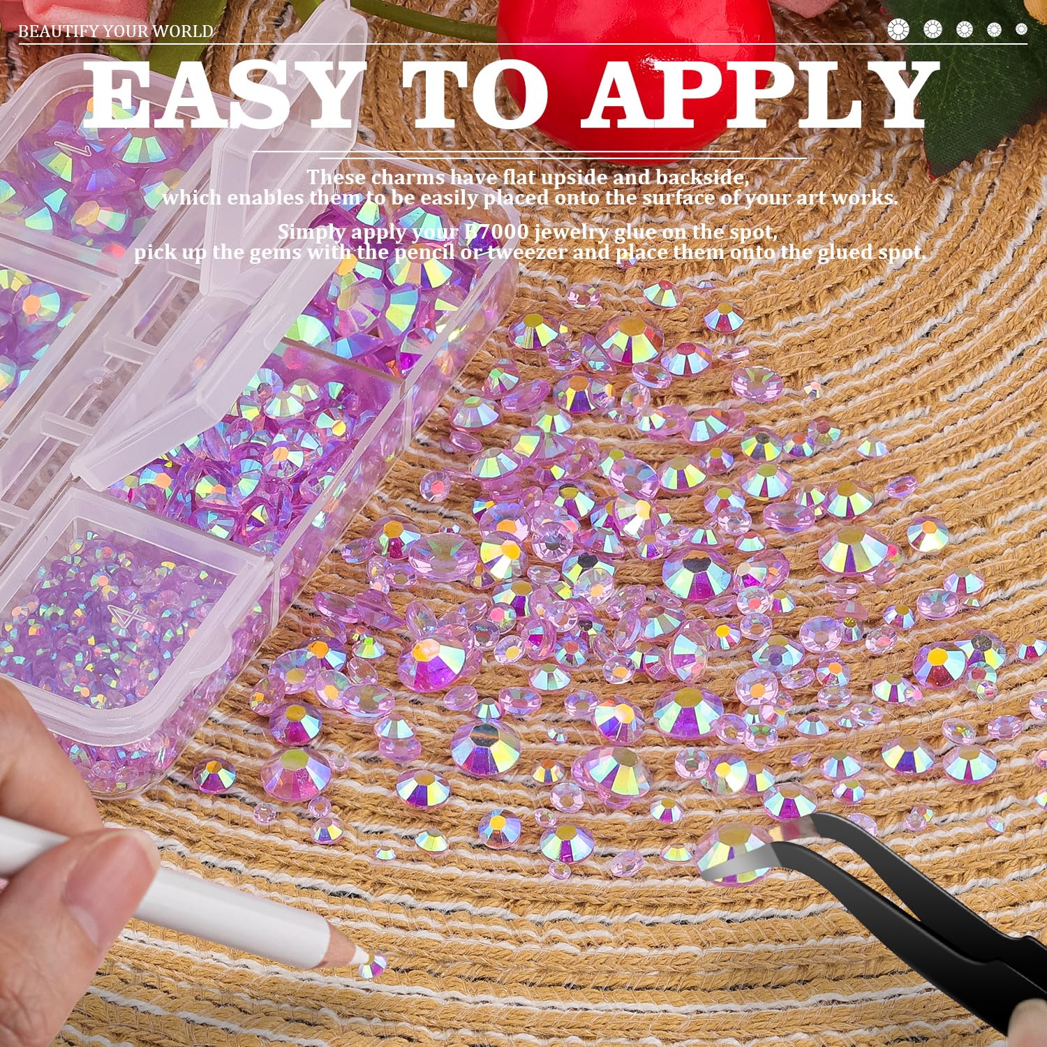 - đWIDE APPLICATION -- These sparkling iridescent resin rhinestones are perfect for creating dazzling looks. Use them for face makeup, eye makeup, body art, 3D nail art or bedazzling DIY crafts like shoes, tumblers, mugs, bottles, phone cases, popsockets, scrapbooks, photo frames, diamond paintings, greeting cards, bags, glasses, guitars, keychains, hats, masks, hair clips, bracelets, wristbands, clothing, wedding dresses, and more. Apply it to what you want to bling!