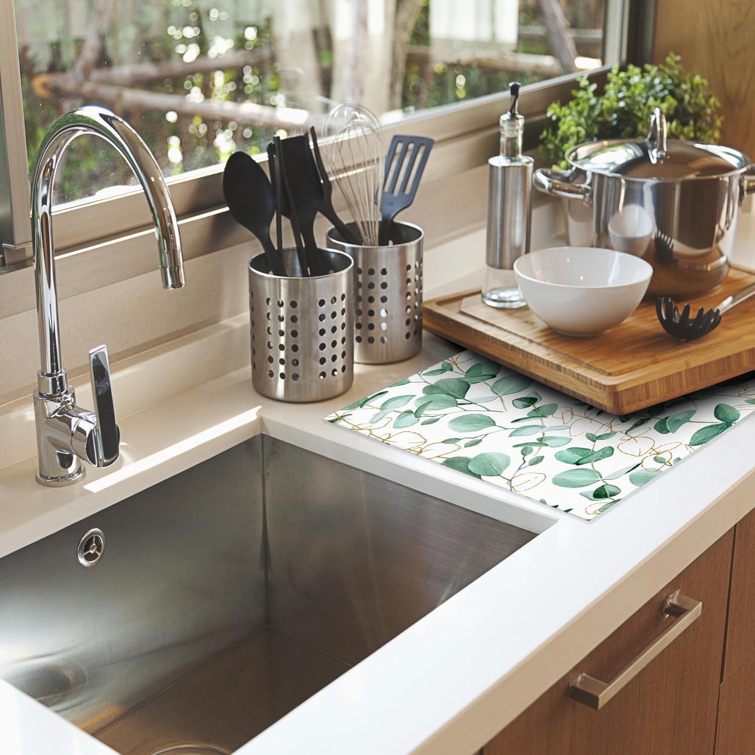 Eucalyptus Leaves Dish Drying Rack Mat for Kitchen Counter,Vintage Boho Dish Drying Pad Absorbent Reversible Microfiber Protector for Coffee Bar Sink Countertops 18x24 Inch