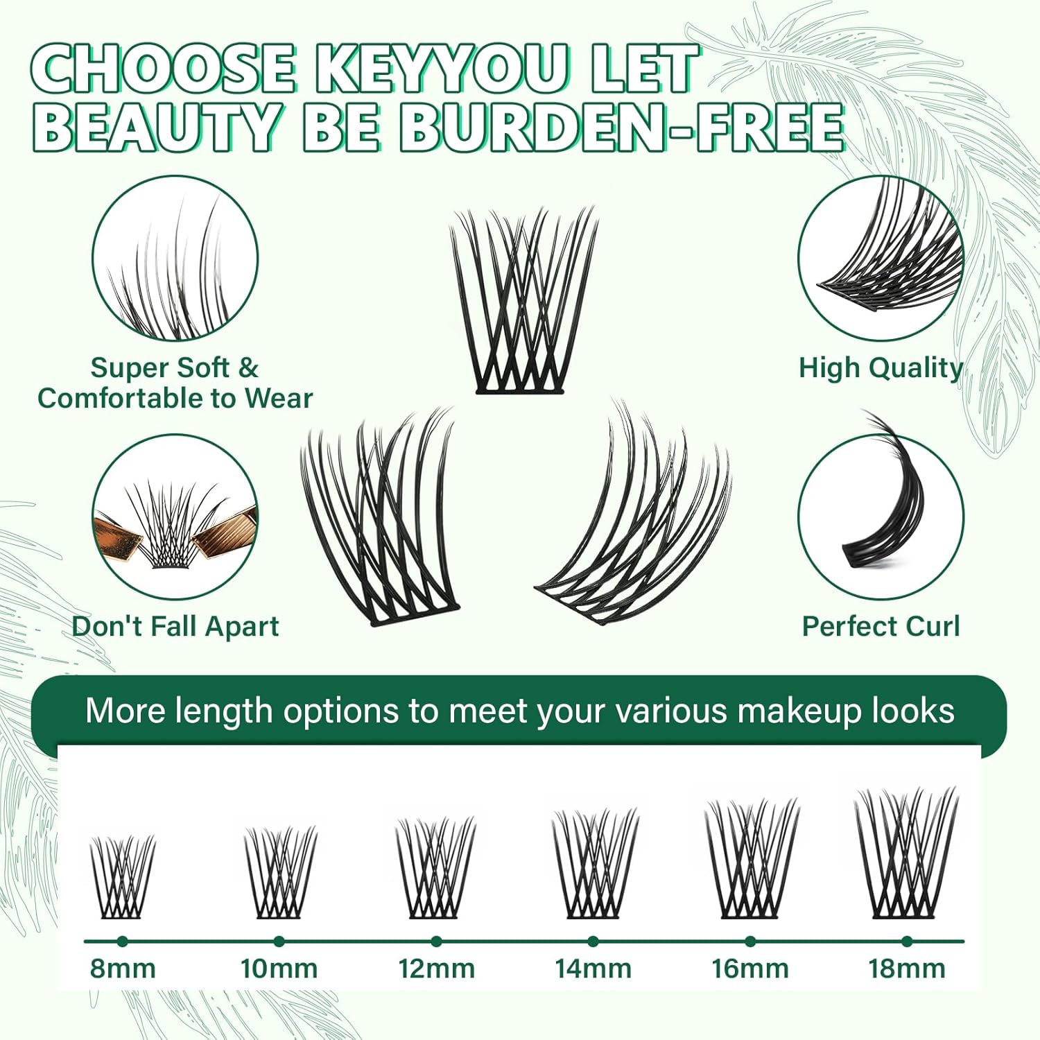 - HIGH QUALITY:KEYYOU lash clusters also made of high-grade fiber material.They have no plastic feel and very natural to wear,don‘t harm the eyes.