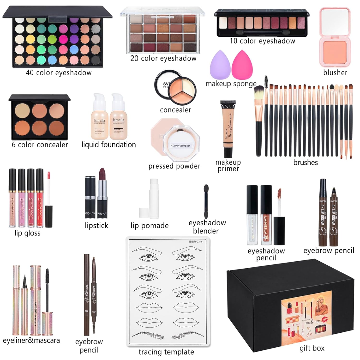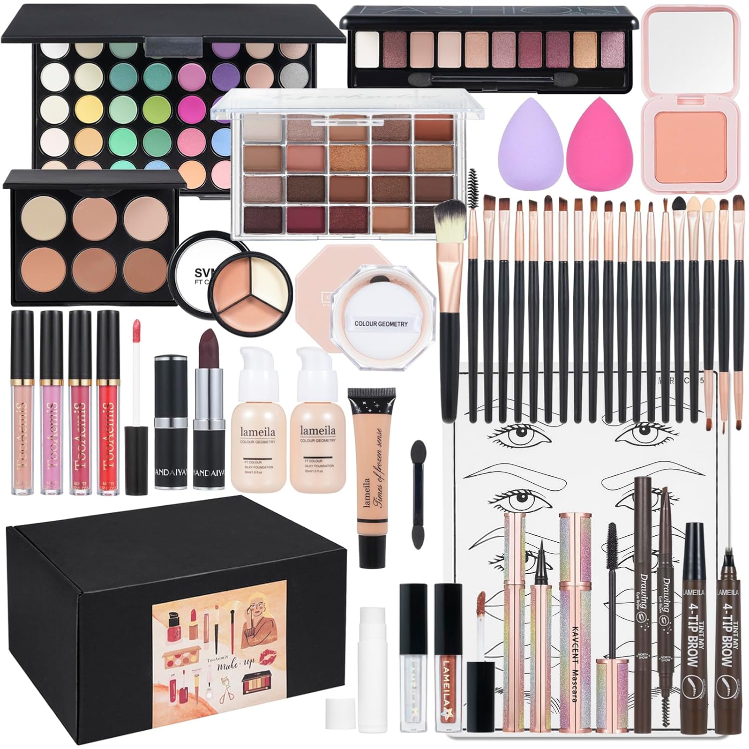 - 【All In One Makeup Kit】All In One Makeup Kit For Girls --- The beginner makeup gift set including 16 Colors Eyeshadow Palette, Nude & Buff Beige Foundation, Face Primer,4Pcs Liquid Lipsticks, Contour Stick, Eyebrow pencil, Winged Eyeliner Stamp, Mascara, Makeup Brush, 2Pcs Makeup Sponge. The face make up set is perfect for achieving a full-face flawless look.