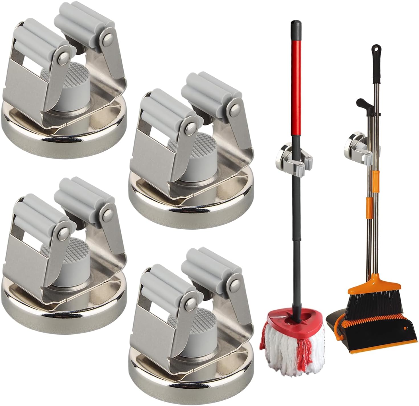 - Instant Install Broom Storage Rack:Package including 4PCS magnetic broom holders.The assembly mop broom hooks are simple to use and reposition when needed, whatever push items in or out. Itâs a good helper for hanging heavy-duty pieces of stuff