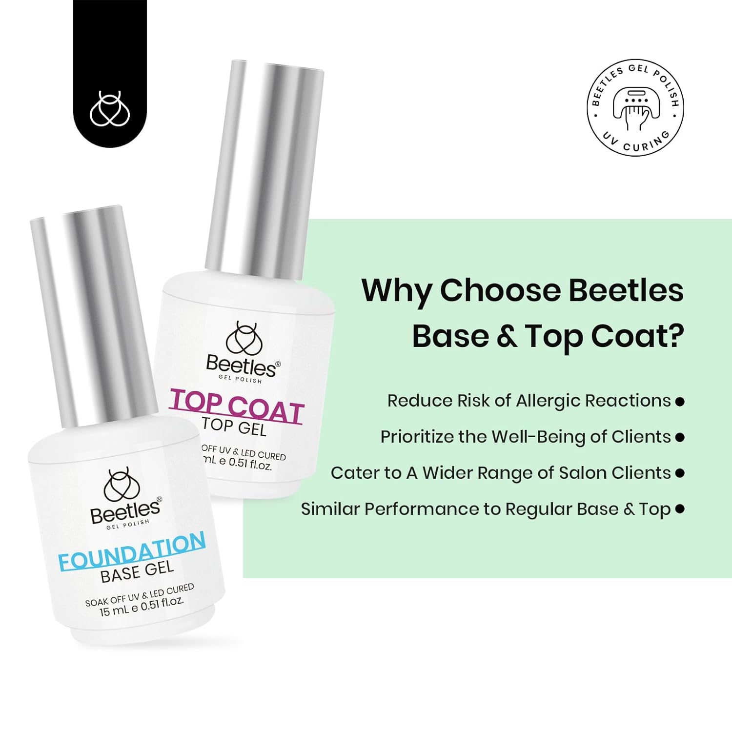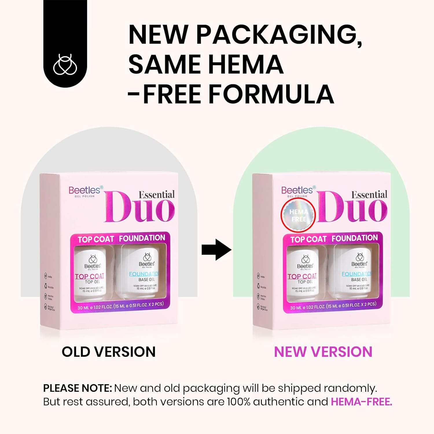 - Hema-Free Gel Base and Top Coat Set: Beetles launches a new HEMA-free gel base coat and top coat set with healthier ingredients. You donât have to worry about HEMA allergies when doing a manicure, providing a safe and healthy nail care experience. Please read the product ingredient list and instructions carefully. If you have any questions, contact us to help you. Tips: Avoid touching your nails after curing the top coat for 2 minutes to enhance the shine.