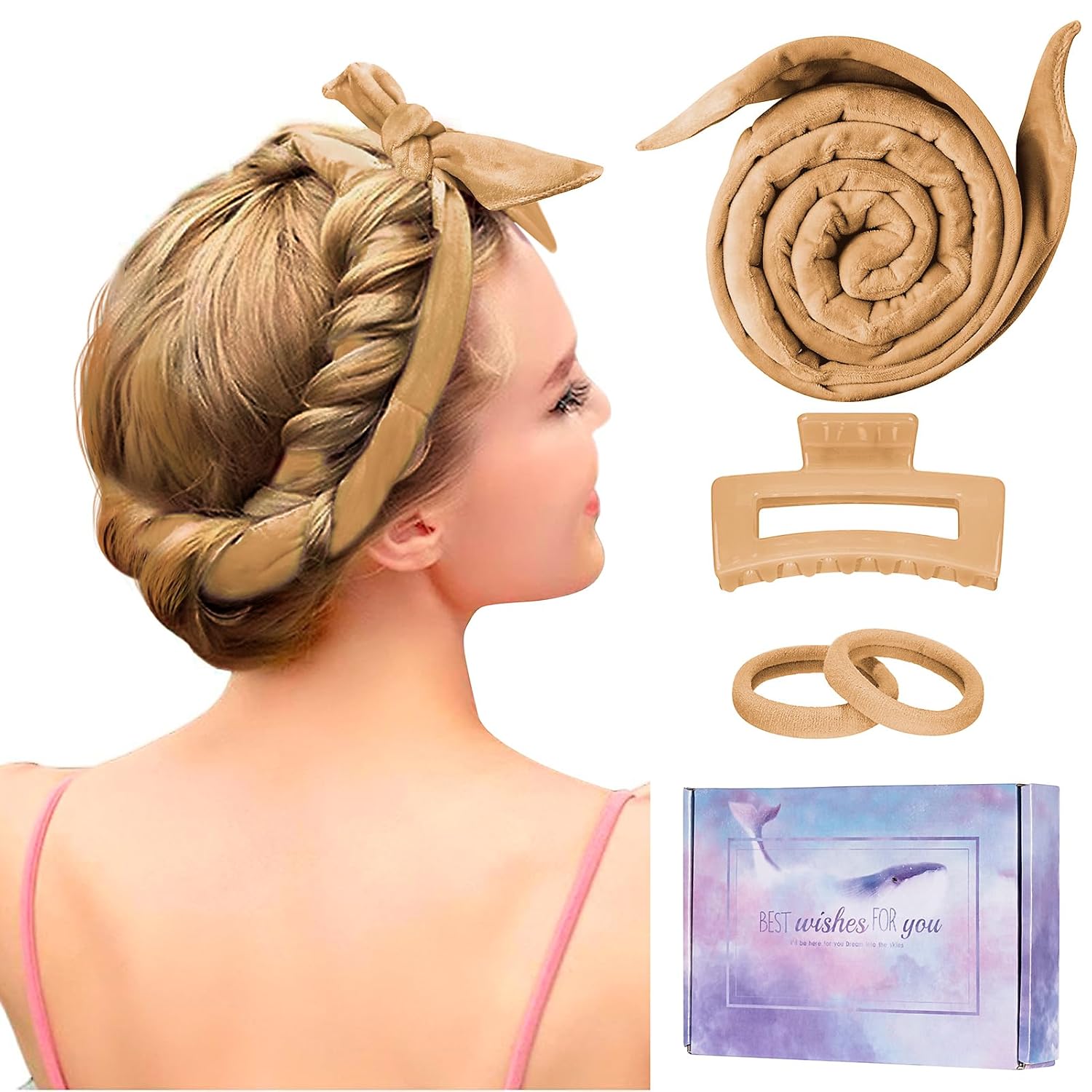 - Easy to Use & Tips---1. Lightly damp your hair or drying your hair to slightly damp after shower 2. Fix the middle part of the curling iron on the top of the head with a bobby pin. 3. Wrap the hair on both sides around the curling iron respectively. When the hair is braided to the end, secure it with a hair tie. 4. Cross the two ends of the hair band behind the head, tie a knot in front of the hairpin on the top of the head, and remove the hairpin. TIPS: Spary with styling to last longer.