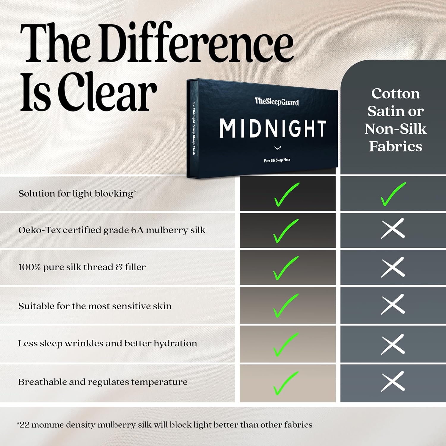 - ✅ INVEST IN YOUR SLEEP - Experience TheSleepGuard difference with our luxury sleeping masks. Crafted from the highest grade 6A Mulberry silk at 22 momme and certified by Oeko-Tex to ensure you sleep soundly. Remember, better sleep leads to a better you.