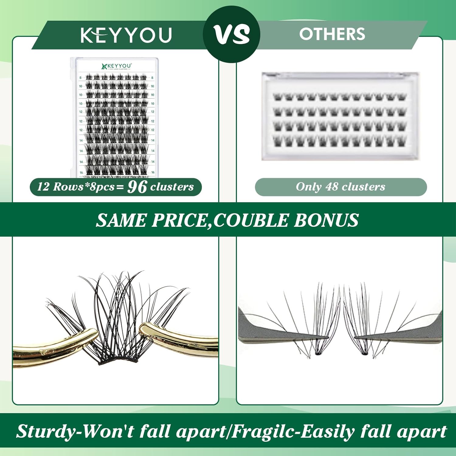 - 【Soft&Comfortable】KEYYOU lash cluster are made of imported materials,the stem line is thinner and softer, the eyelash cluster are lighter and more comfortable to wear.96 clusters in one tray ,more cost-effective.