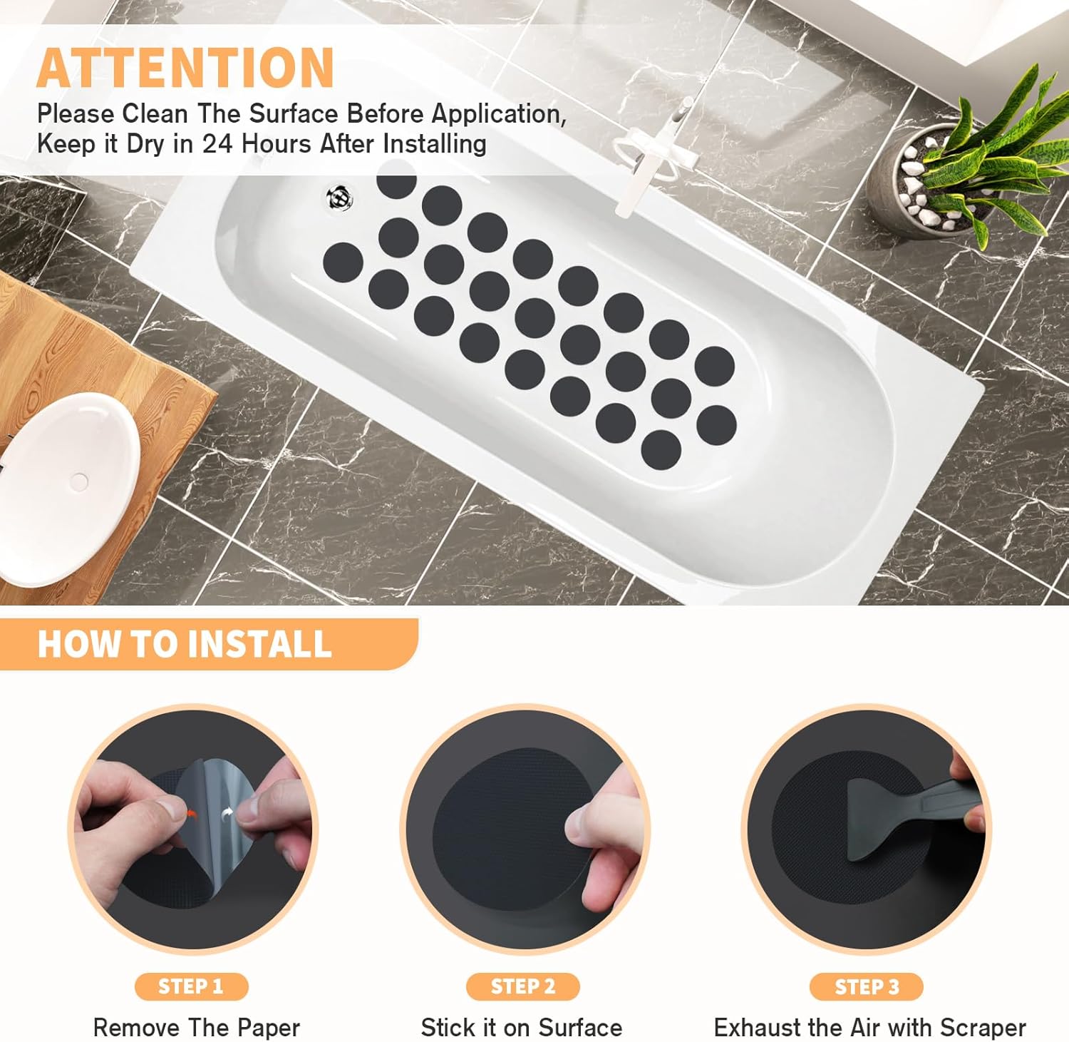 - 【Easy to install】It's easy to install this non slip bathtub stickers. Simply peel off the backing paper and place the tread in the clean and smooth surface, and then use the scraper to help you press the stickers to ensure strong adhesiveness or remove the stripe.
