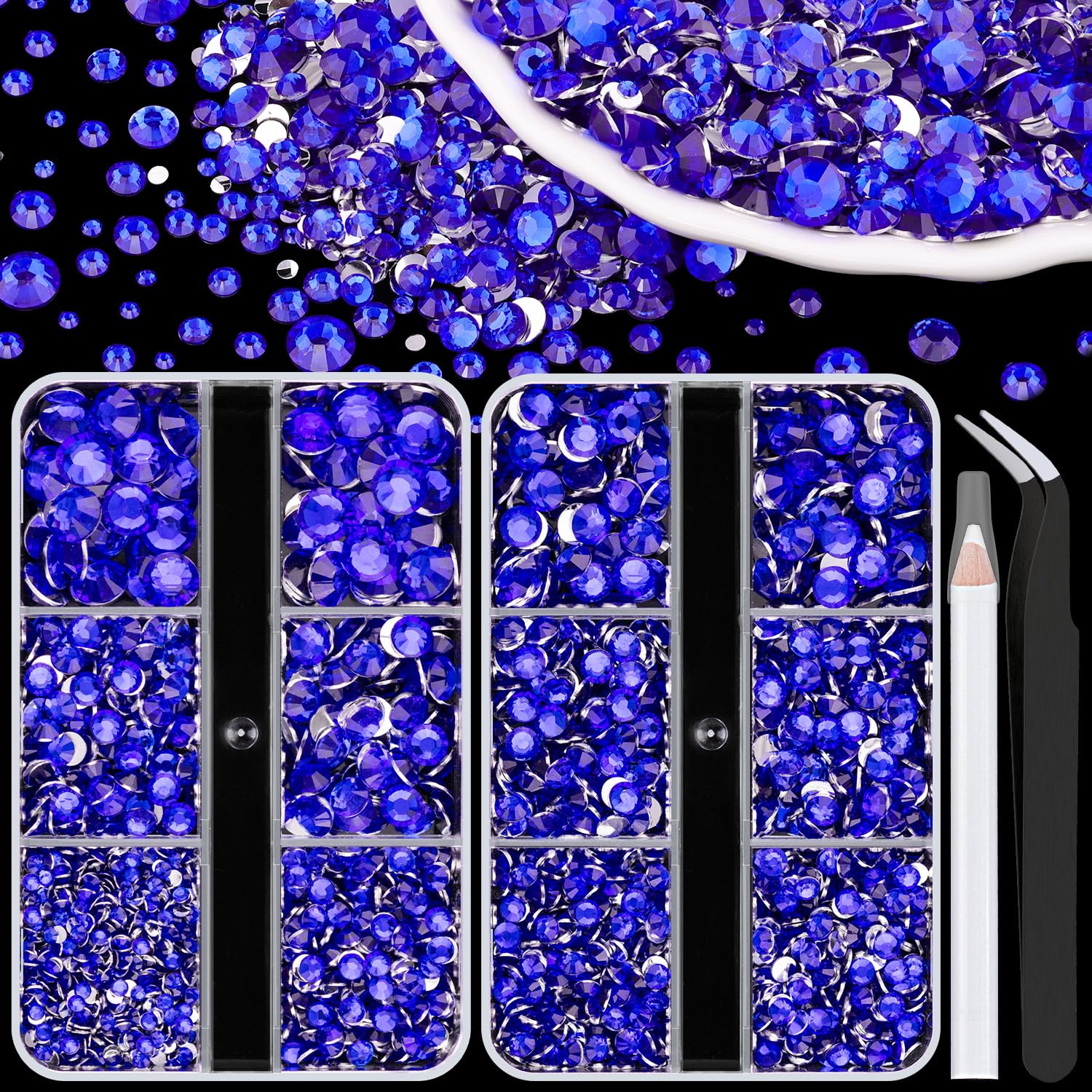 - đPACKAGE CONTENT -- This resin rhinestone package includes 2 boxes with 6 grids, featuring a variety of sizes: Box #1 contains 2mm x 1 grid, 3mm x 1 grid, 4mm x 1 grids, 5mm x 1 grids, and 6mm x 2 grids; Box #2 contains 3mm x 2 grids, 4mm x 2 grids, 5mm x 2 grids. 1 tweezers and 1 pickup pen are included for easily picking up of rhinestones. This set offers more large-sized gems, making it perfect for DIY craft decorations, eye makeup, face makeup and nail art.