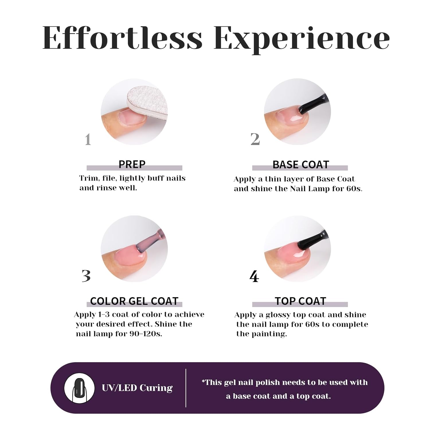 - 🎨Speed Curing with LED Nail Lamp: The gel nail polish kit need to be cured under LED light. Base and Top coat required. Average for LED light 60-120 secs.