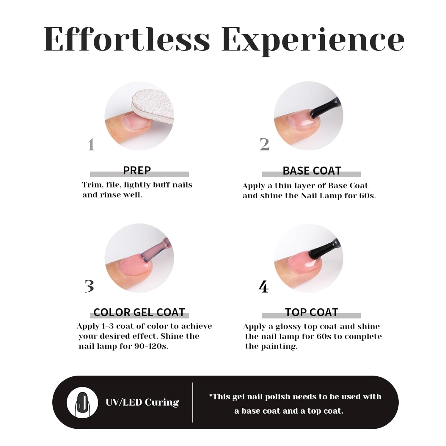 - đ¨Speed Curing with LED Nail Lamp: The gel nail polish kit need to be cured under LED light. Base and Top coat required. Average for LED light 60-120 secs.