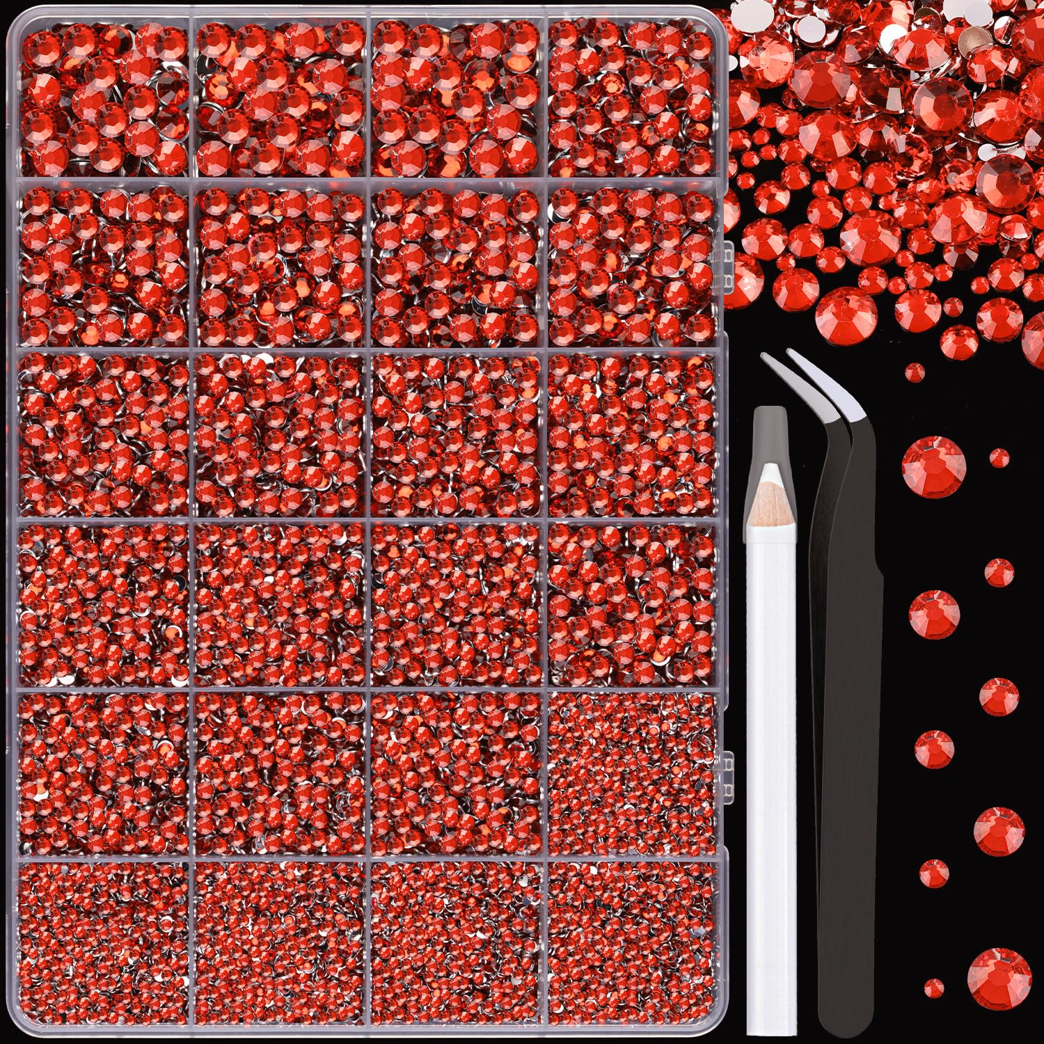 - 💎PACKAGE CONTENT -- The package includes 1 box with 24 grids, featuring a variety of sizes: 2mm x 5 grid, 3mm x 6 grid, 4mm x 5 grids, 5mm x 5 grids, and 6mm x 3 grids, approx. 25000 pcs of 2-6mm bling-out resin rhinestones (Red). 1 tweezers and 1 pickup pen are included for easily picking up of rhinestones. The large amount will support you to fulfill a number of your wonderful DIY decoration ideas.
