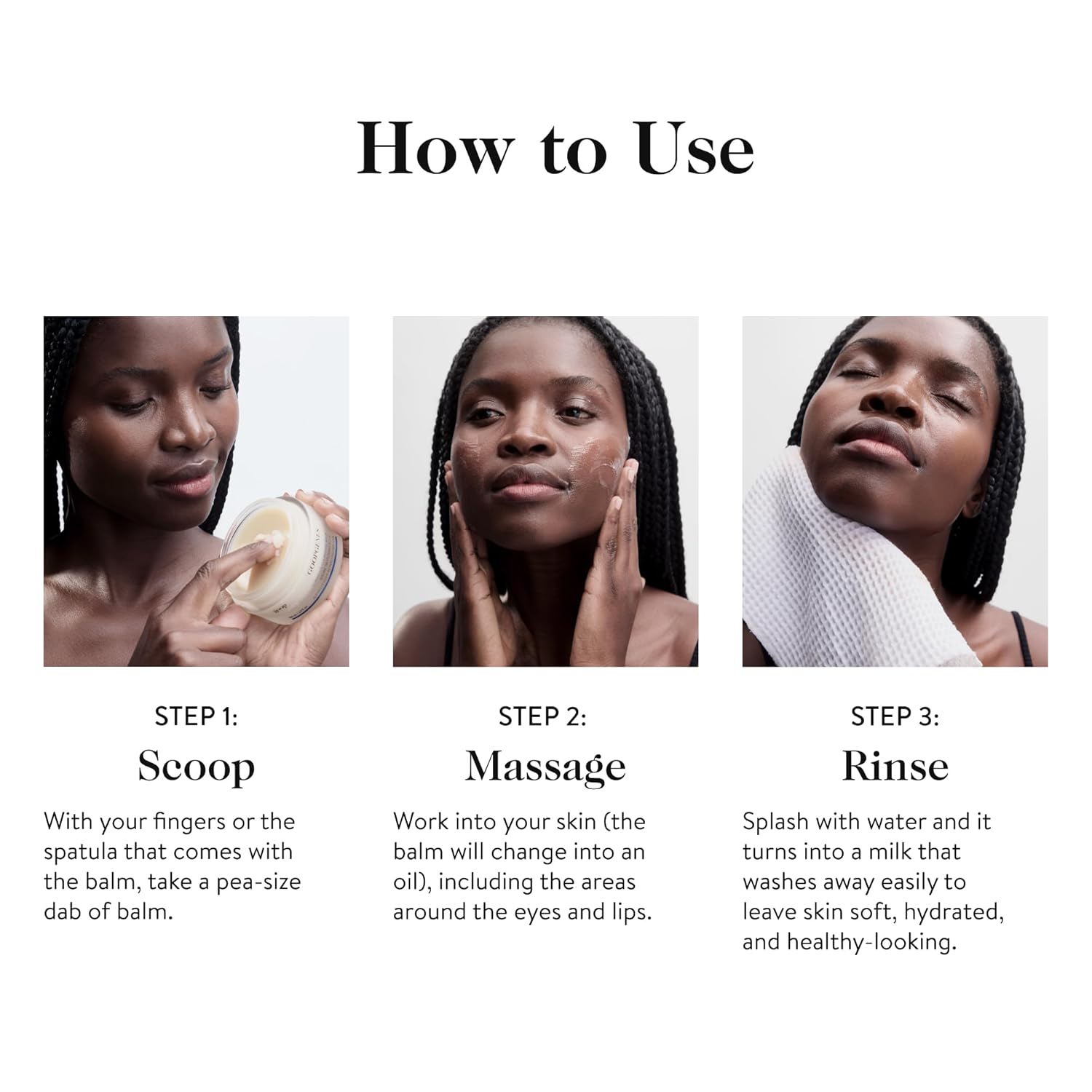- How to Use: Massage the face balm into dry skin, using circular motions as the melting balm turns into an oil. Wet the organic-cotton cloth (included) with warm water and smooth over skin as the oil turns to milk; rinse to finish.