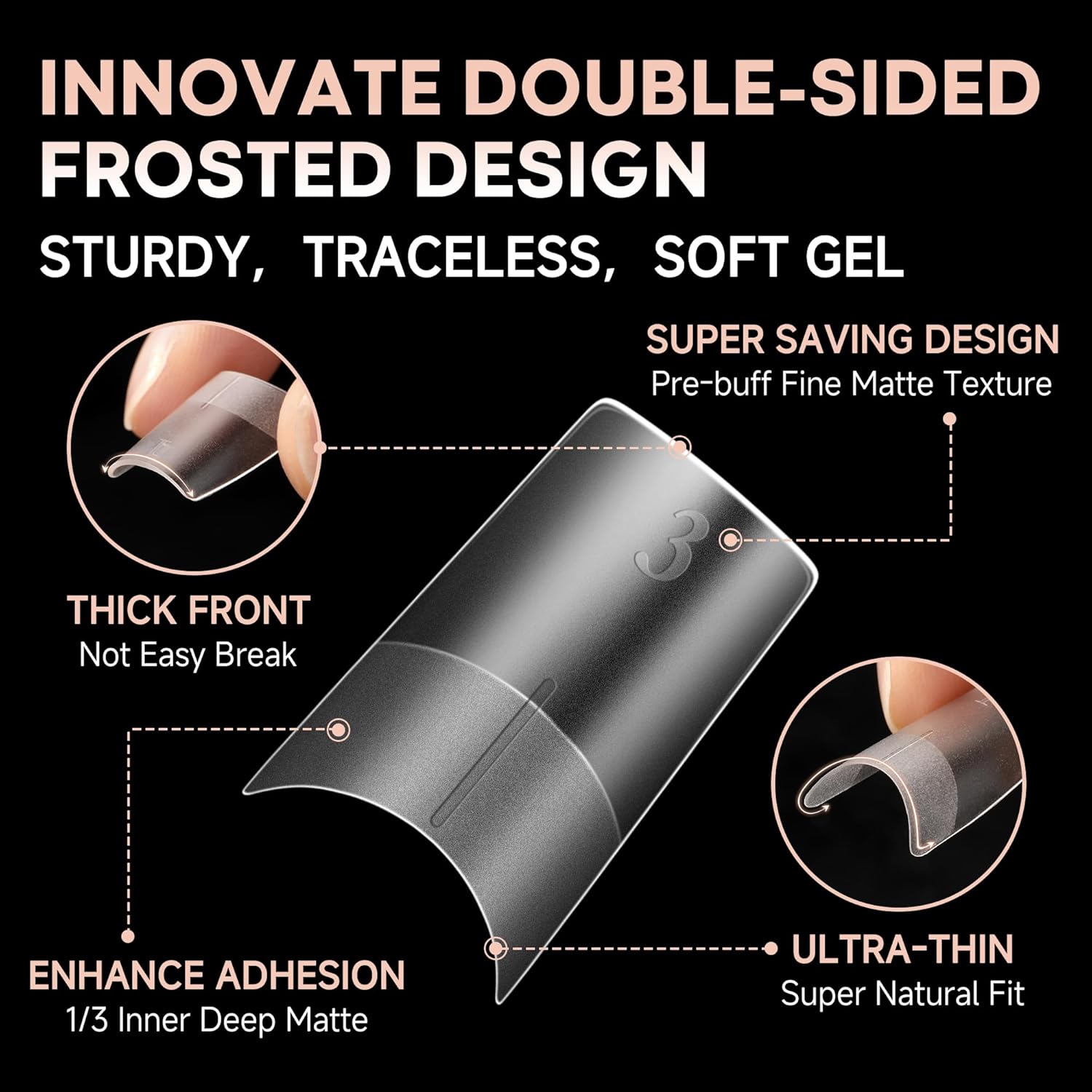 - đNEWLY DOUBLE SIDE MATTE TEXTURE-Our medium square gel nail tips upgraded double-sided frosted design. The surface pre-buff with fine matte for applying base coat gives a glossy look. And 1/3 inner pre-buff with deep matte for better adhesive nails. "Thick Front, Ultra-thin Back" design benefit of break-resistant and ultra fit. Let you enjoy this unprecedented professional nail salon enjoyment!