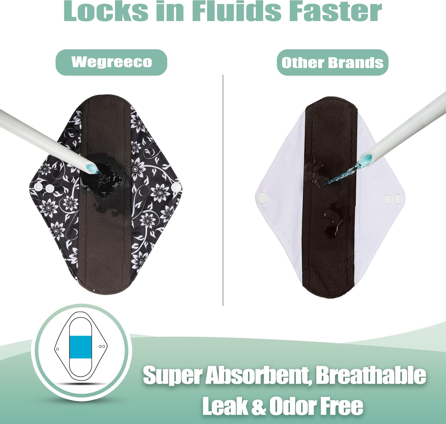 Wegreeco Reusable Menstrual Pads - Soft Cloth Sanitary Pads & Panty Liners - 6 Pack with 1 Cloth Mini Wet Bag (Large, Black Flowers)