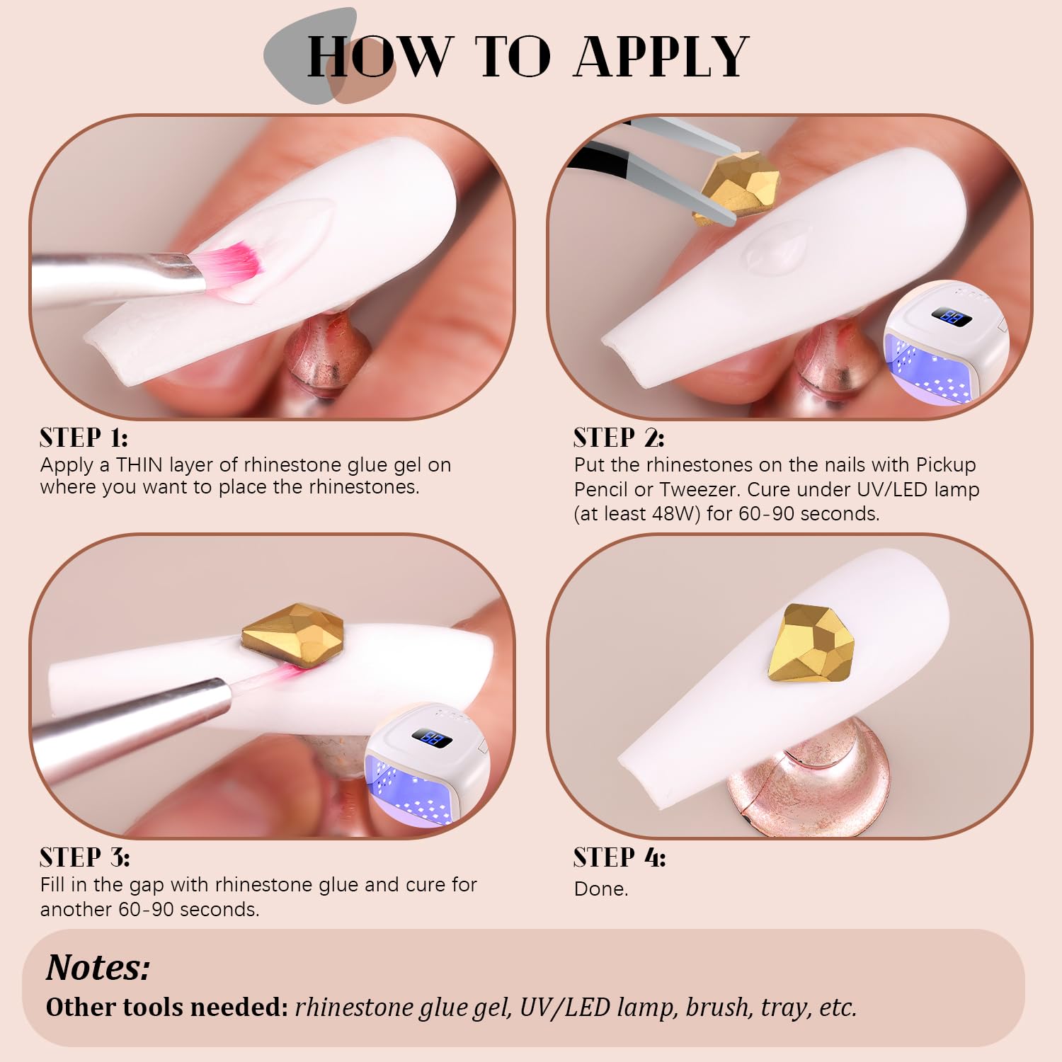 - đEASY TO USE -- Easy to apply on artificial nails. After applying nail polish and applying enough gel on the nails, simply use the equipped tools (pickup pen + tweezers) to pick up the crystals onto your nails to create your fabulous DIY designs! These crystals gemstones are different from those hotfix stones, they are not self-adhesive, you have to apply glue to stick them (glue is not included.)