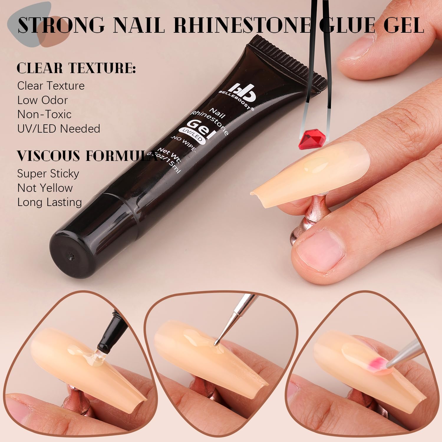 - đADHESIVE GEL GLUE: The rhinestones glue gel uses a special, non-toxic and eco-friendly formula with strong tackiness, adhesion, and fluidity for easily applying decorations. It is a type of UV gel glue. After proper curing under a UV/LED lamp, the glue dries clear with superior bonding strength that can last a few weeks without falling off. With the designed tip, you can easily and conveniently apply the glue to the nail bed or the surface of false nails.