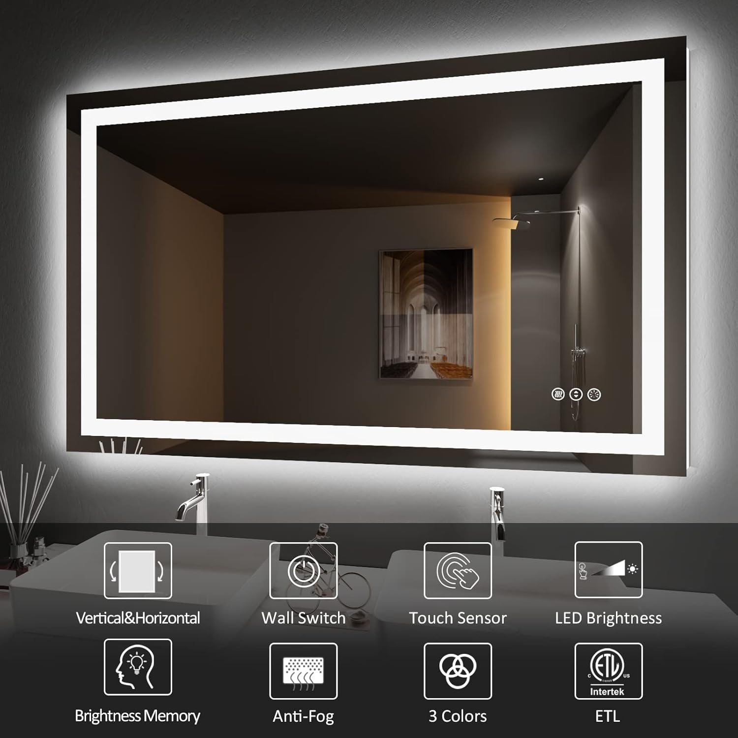 Amorho LED Bathroom Mirror 60" X32" with Front and Backlight, Stepless Dimmable Wall Mirrors with Anti-Fog, Shatter-Proof, Memory, 3 Colors, Double LED Vanity Mirror