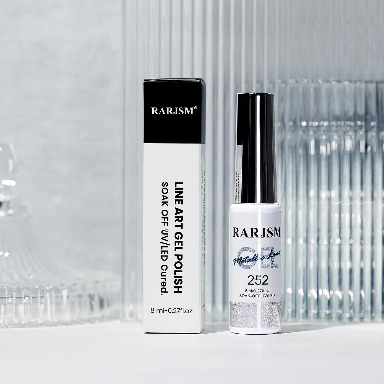 RARJSM Metallic Silver Nail Art Gel Liner Mirror Chrome 3D Holographic Laser Rainbow Effect Gel Nail Polish 8ml Build in Thin Brush Painted Drawing Striper Painting Curing Requires for Home Salon