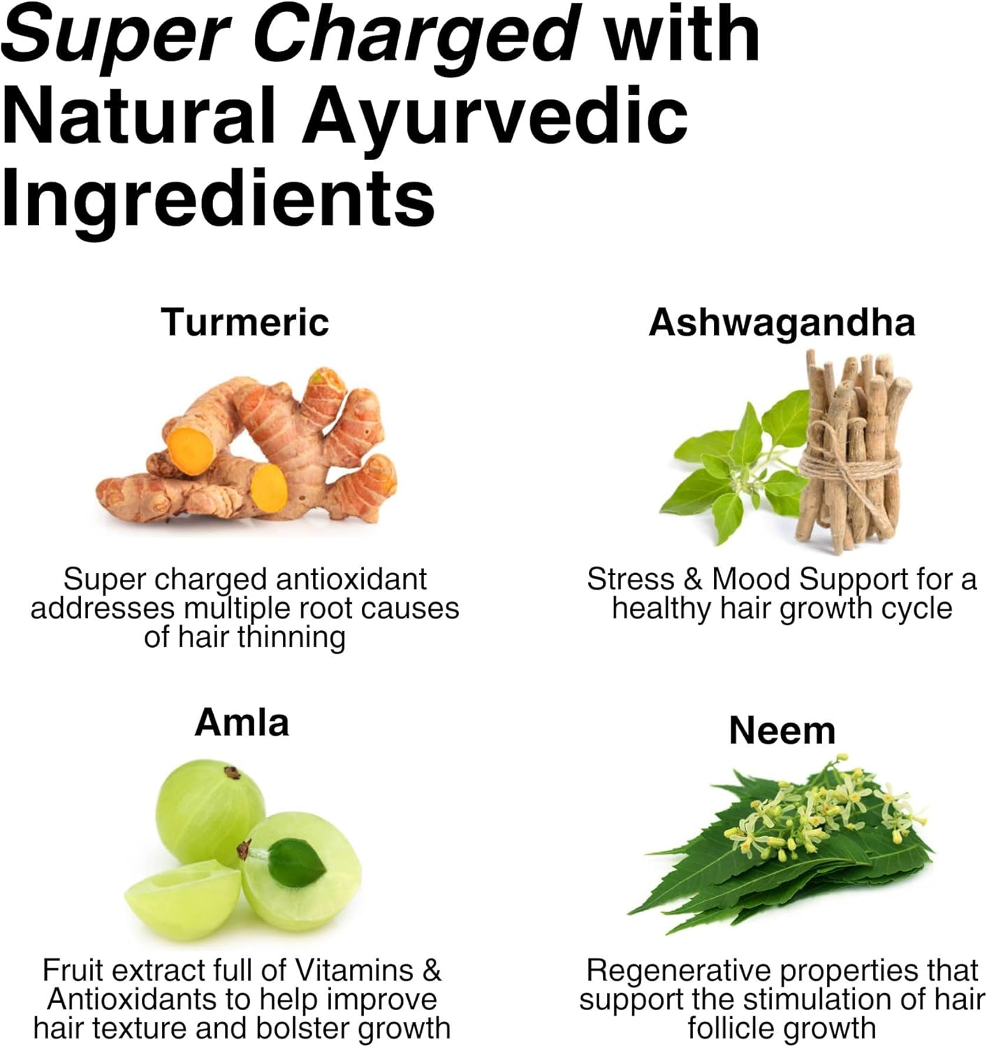 - 𝐅𝐨𝐫 𝐩𝐞𝐨𝐩𝐥𝐞 𝐰𝐢𝐭𝐡 𝐢𝐧𝐜𝐫𝐞𝐚𝐬𝐞𝐝 𝐬𝐡𝐞𝐝𝐝𝐢𝐧𝐠 𝐚𝐧𝐝 𝐝𝐞𝐜𝐫𝐞𝐚𝐬𝐞𝐝 𝐡𝐚𝐢𝐫 𝐝𝐞𝐧𝐬𝐢𝐭𝐲. Hair Vitamins like Folate which aids in nutrient absorption and helps in the production of keratin, a protein that makes up the structure of hair. Ayurvedic ingredients like Ashwagandha Root, Turmeric, Amla fruit powder help increase hair growth, density and strength.