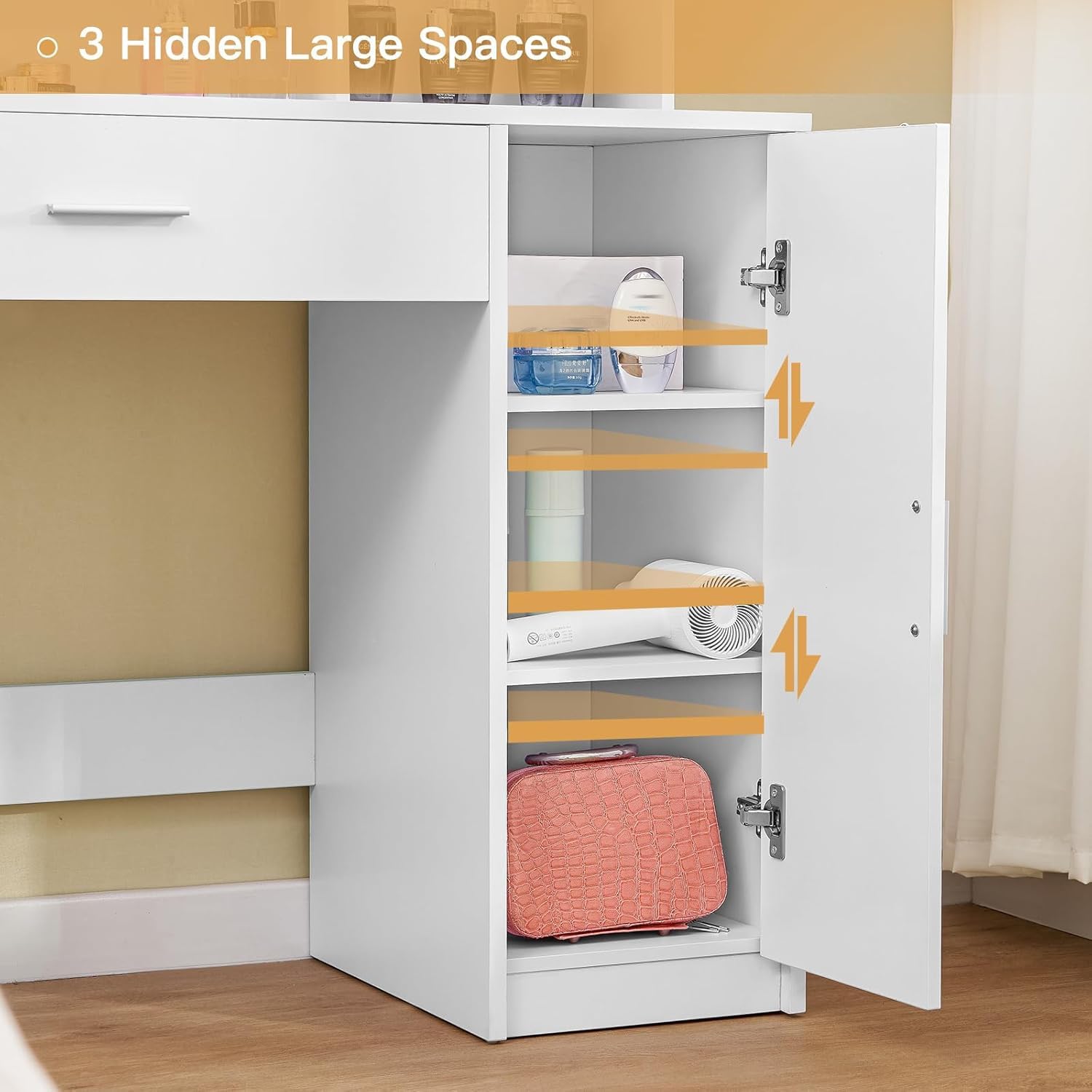 - ăLarge StorageăThis vanity desk contains 1 oversize drawer, 3 open shelves and 1 large cabinet with 2 height adjustable shelves, provide ample space for all your cosmetics, skin care products, jewelry and other beauty supplies. The dividers in the large cabinet below has three levels of storage to allow you to sorted and stored neatly items.