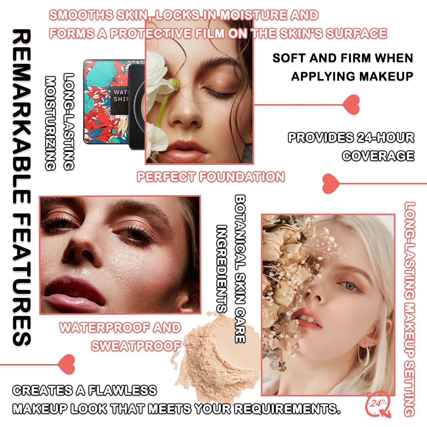 Mushroom Head Air Cushion CC Cream Full Coverage Liquid Foundation Set,Oil Control Concealer Lasting Moisturizing BB Cream,Loose Setting Face Powder Moisturizer Base Primer Makeup with Makeup Sponge