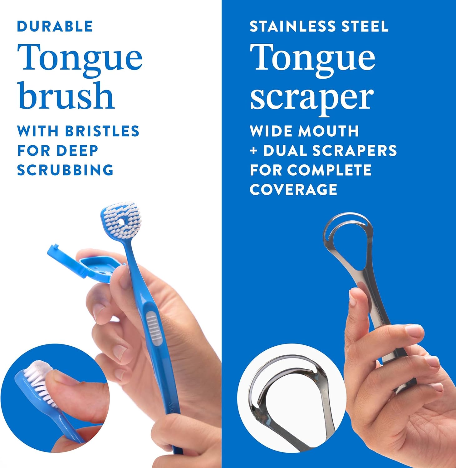 Mouthology Tongue Brush & Tongue Scraper (Combo Pack), Reduce Bad Breath & Improve Oral Hygiene, Tongue Scraper Brush for Adults Ergonomic Handle & Protective Cap, Tongue Cleaner