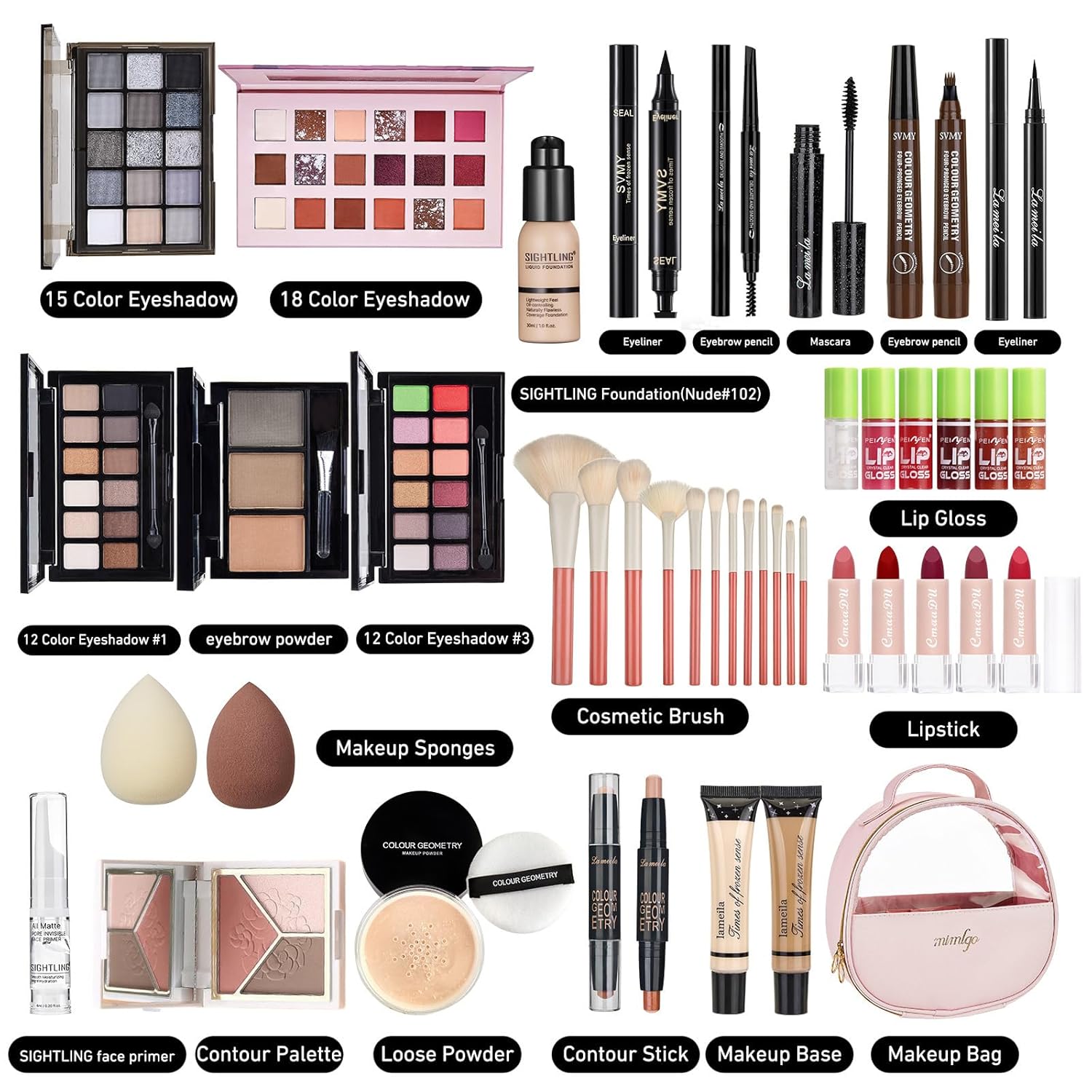 - ăAll in One Makeup KităThis Makeup Gift Set includes everything you need for a full-face look: face foundation makeup, eyeshadow palette, contour palette, Contour Stick, eyebrow powder, powder puff, lipstick, eyeliner, Marscara, cosmetic brush and travel bag. Designed to cater to all your daily makeup essentials, this kit is perfect for both beauty beginners and seasoned pros.