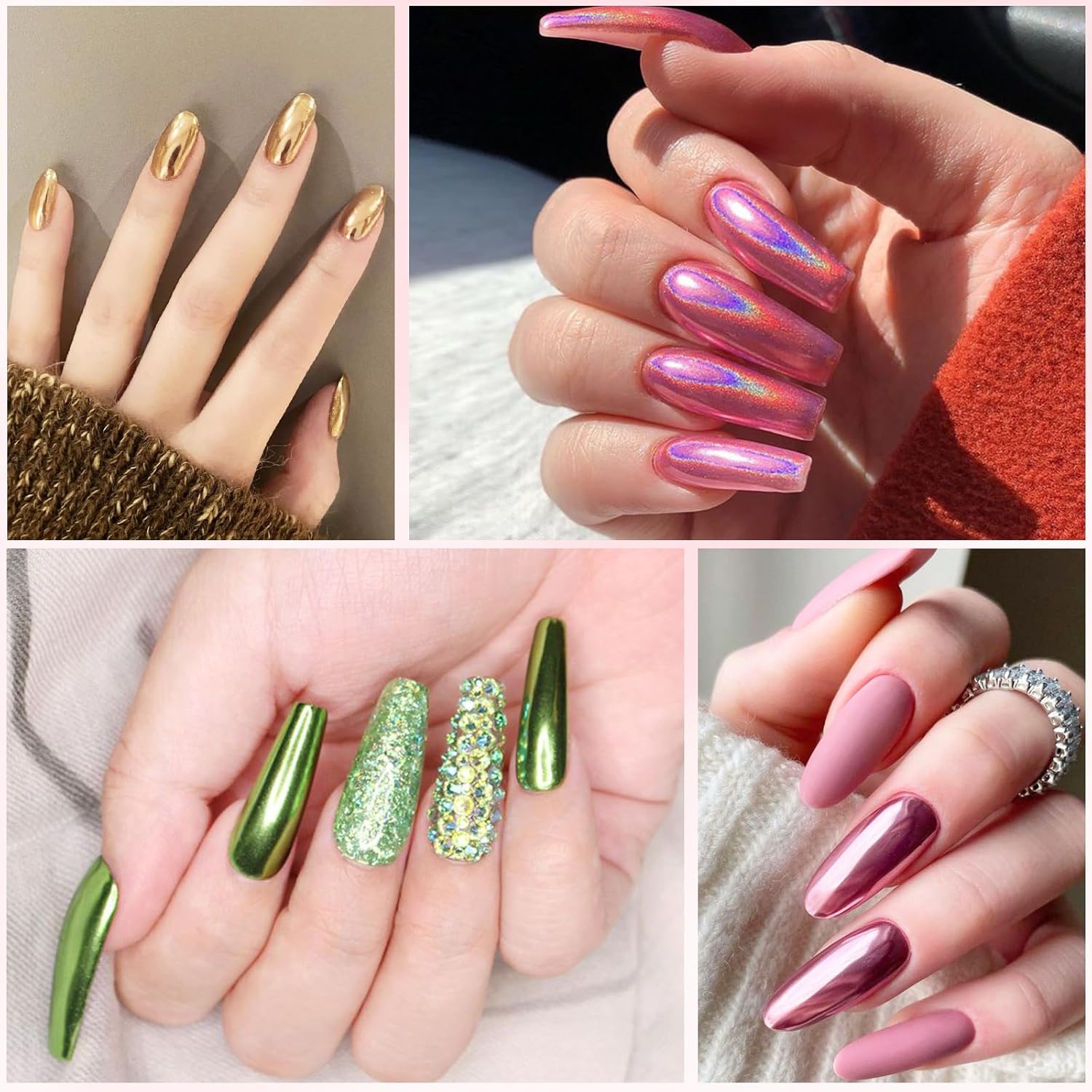 - EASY TO USE & WIDE APPLICATION - Gold silver chrome nail powder is easy to use, suitable for both beginners and experts. No special manicure skills required, just follow the instructions and you'll get a stunning mirror-effect manicure. Rainbow chrome nail powder can be used on U V gel nails, acrylic nails, natural nails, or can be mixed into gel polish to DIY new gel nails.