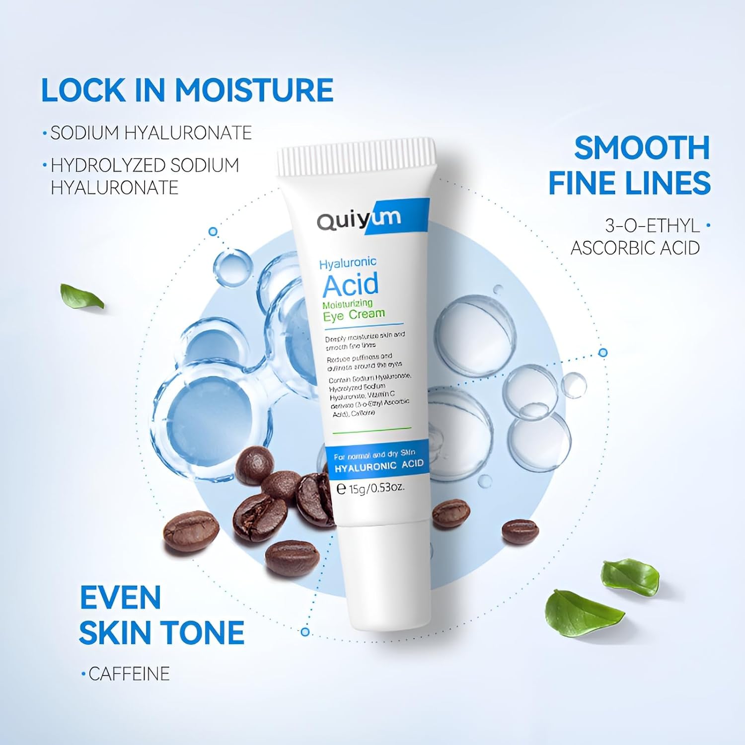 - Intense Moisturizing: Hydrating Eye Repair Cream is formulated with sodium hyaluronate, a key ingredient known for its moisturizing properties. It effectively moisturizes the delicate skin around the eyes, locking in moisture from deep within, enhancing elasticity, and reducing dry lines around the eyes. It also contains small molecule vitamin C and caffeine, which stimulate collagen production, improve eye puffiness and dark circles.
