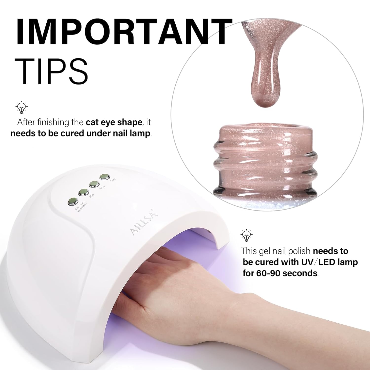- CRYSTAL SPARKLING EFFECT - AILLSA Cat Eye Gel Nail Polish has a dense magnetic powder that can be used alone for a mirror-shimmering, crystal-clear manicure or with any base color nail polish, jelly gel nail polish, and other nail polishes.