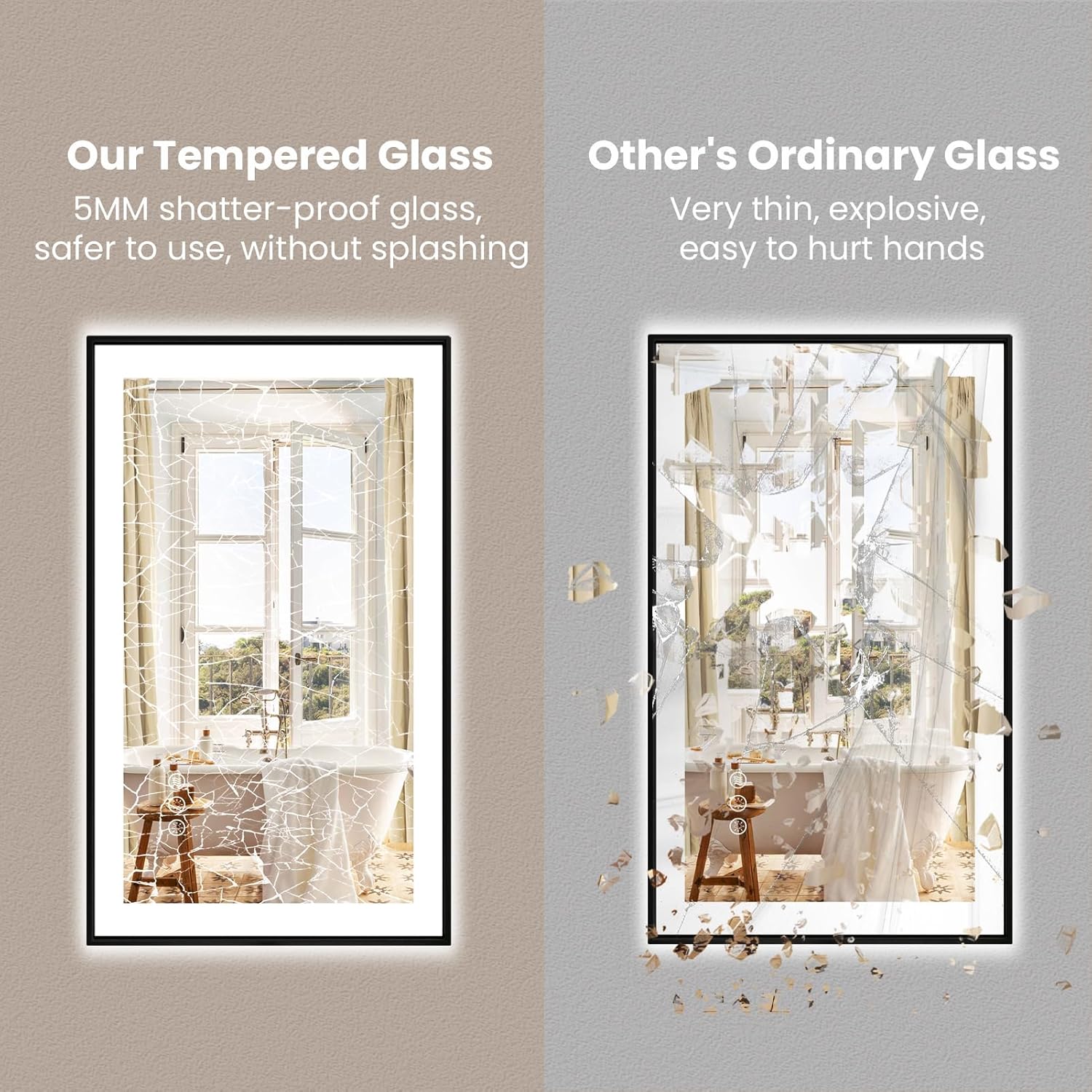 - [Shatterproof & Corrosion Proof]: Our lighted mirror is made of durable tempered glass, highly resistant to breakage and corrosion; It will not shatter into sharp pieces even if broken, will be more safety for home use.