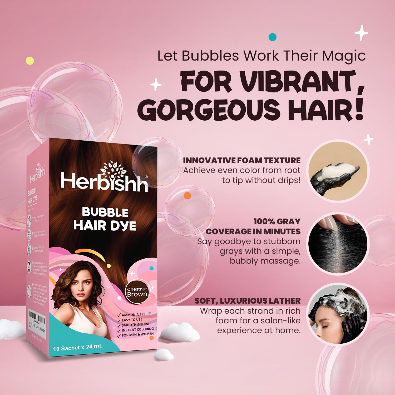 Herbishh Bubble Foam Hair Dye Shampoo, 3 in 1 Dye for 100% Grey Coverage, Permanent Hair Coloring for Men & Women, Long-lasting & Travel-friendly, Ammonia-free, 10 Sachet x 24 ml (Chestnut Brown)