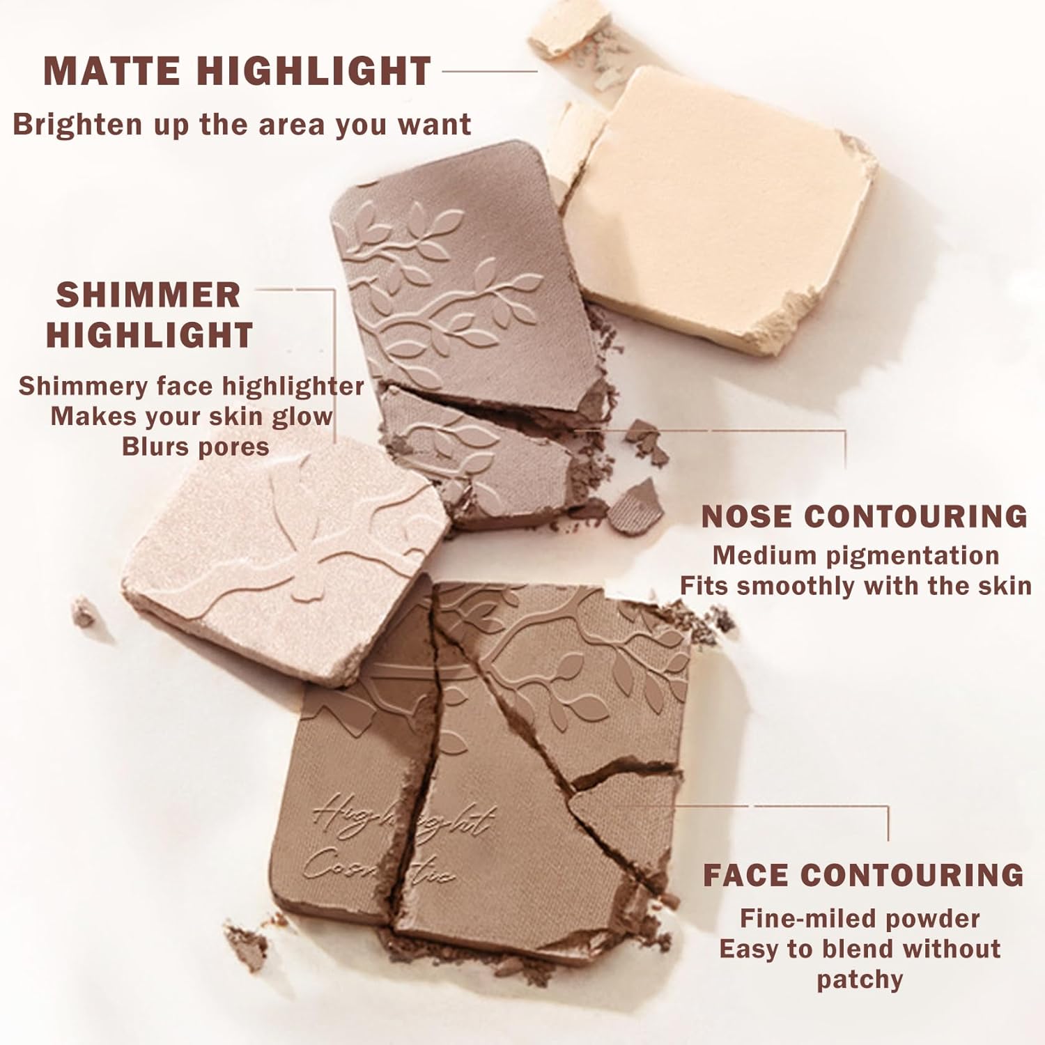 - 【Easy to Apply】Highlighter powder can not only be used for facial highlights and contouring, but also for eye shadows, nose shadows and other purposes. By using different parts, it can create a full-face three-dimensional makeup effect to meet various makeup needs.