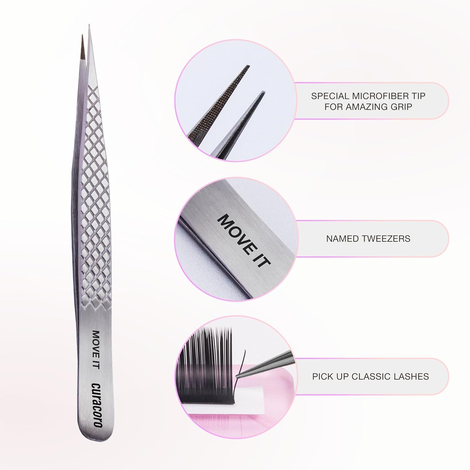 Curacoro Lash Tweezer - Professional & Precision Fiber Tip Grip Lash Tweezers for Eyelash Extensions, Multi Shapes & Purposes Tweezers for Volume, Isolation & Classic Lashes (Silver, Move It)