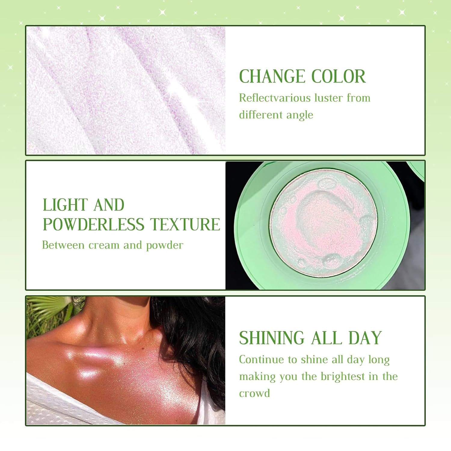 - 【Long Lasting Glow】 Lasting for a whole day that effortless to apply, achieving a diamond-sparkly look, the subtle yet shiny finish of this face highlighter will ensure you stand out in any crowd.
