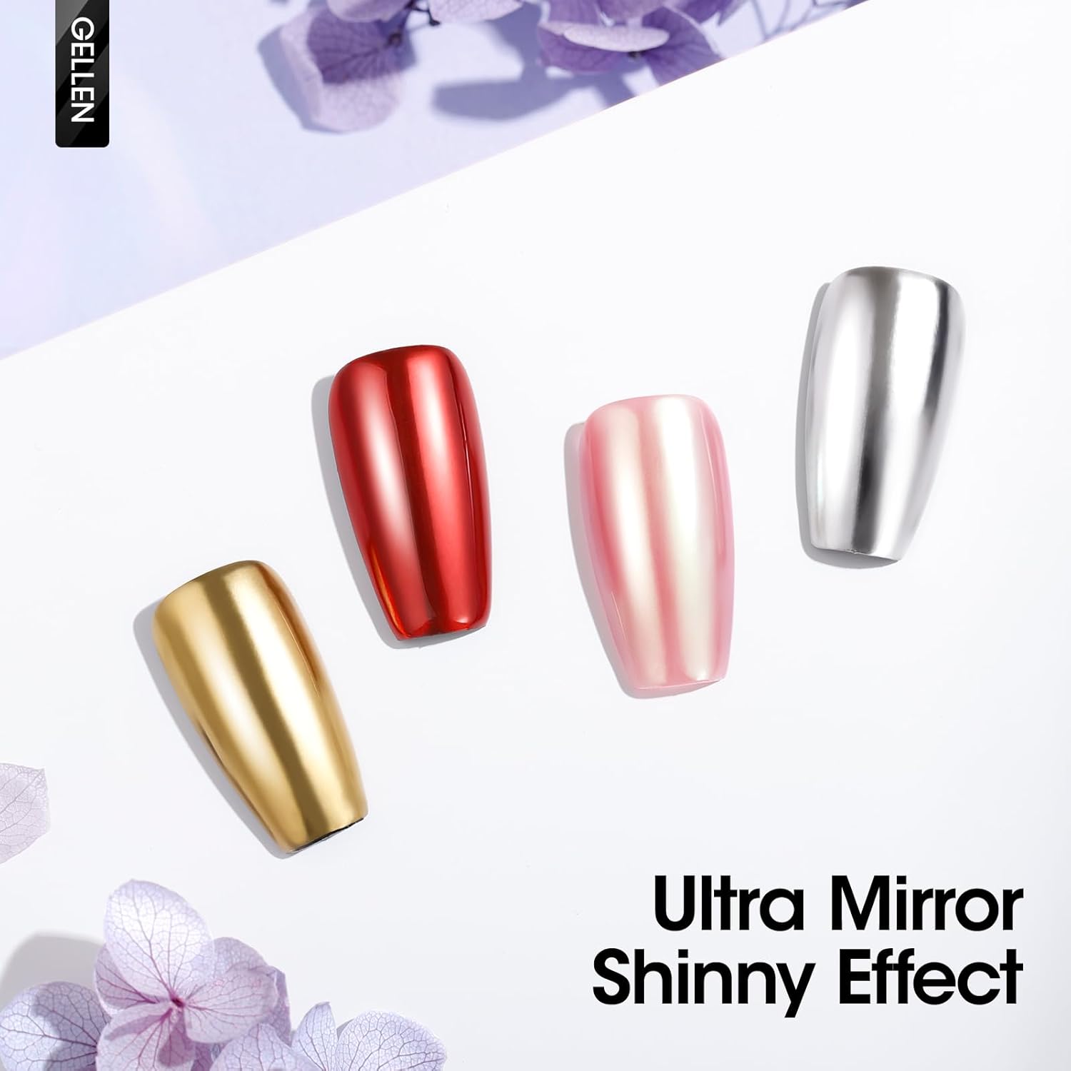 - Gel Top Coat for Chrome Nail Powder, Get Mirror-like Shiny Look: Are you encountering the following two main issues? 1. Difficulty in applying chrome powder onto nail surfaces or tips. 2. Experiencing heavy graininess or patches after application. This Gellen 18ml gel top coat is specifically designed for use with chrome, mermaid, or holographic powders, effortlessly facilitating their application and ensuring a mirror-like glossy effect without any graininess.