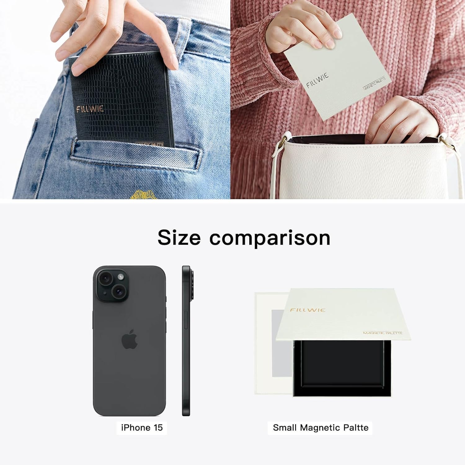 - Magnetic Palette Dimensions: External dimensions: 10.4x10.4x1.5 cm (4.1x4.1x0.6 inches); internal dimensions: 8.2x8.2x0.7 cm (3.2x3.2x0.28 inches). Can accommodate approximately 9 to 12 one-inch eyeshadow pans, depending on the layout