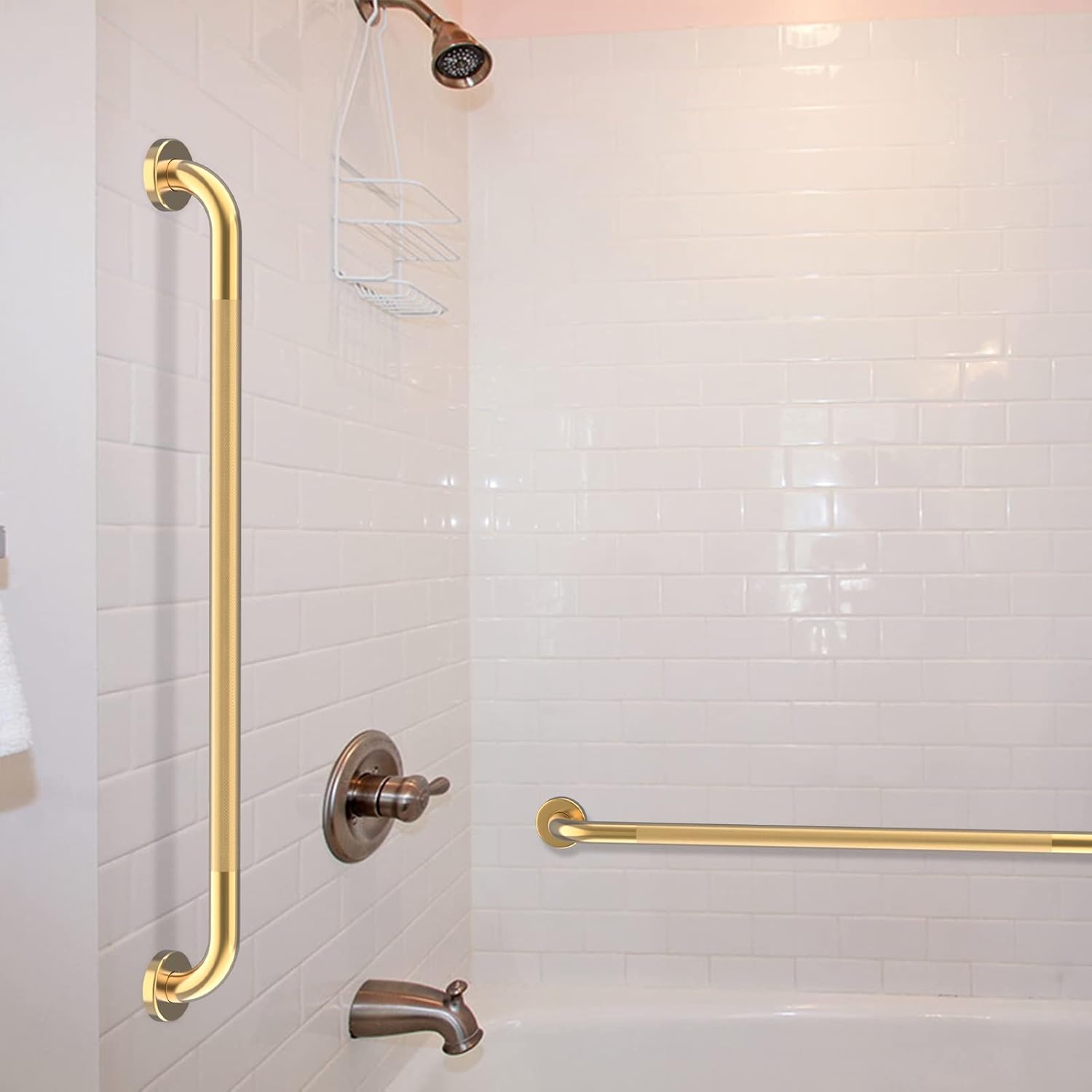 - Use 36 inch anti slip Oil Rubbed gold knurled safety grab bars in the bathroom, kitchen, along stairways, or in the laundry room for additional fall prevention, especially for the handicap, elderly, pregnant women, and children. Not only apply to use as bath shower grab bar, but also can hold clothing,etc.